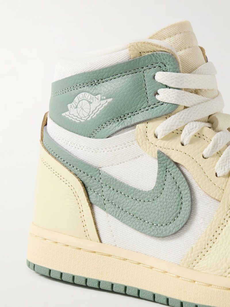 - Gray-green and ecru leather, white twill