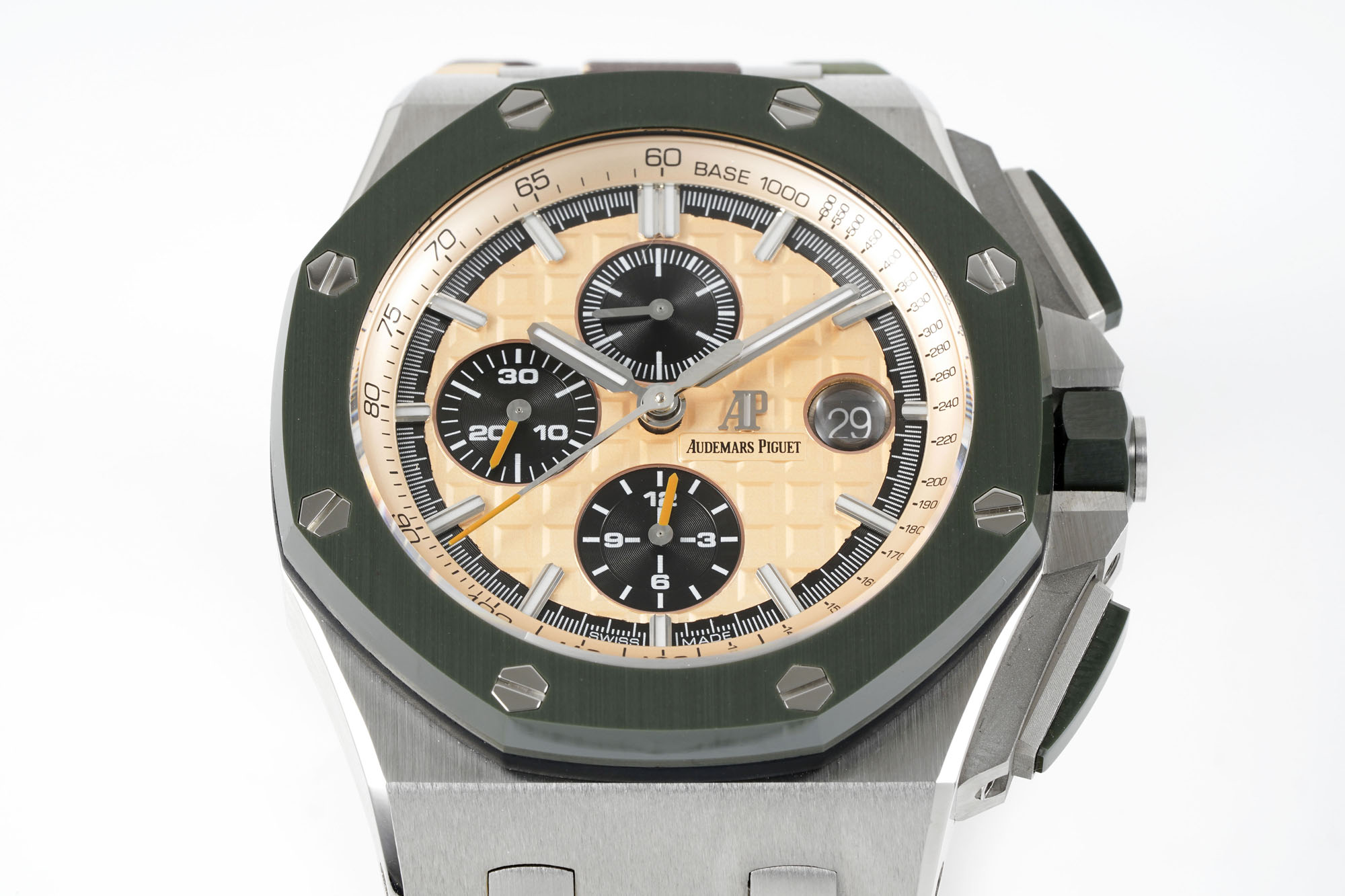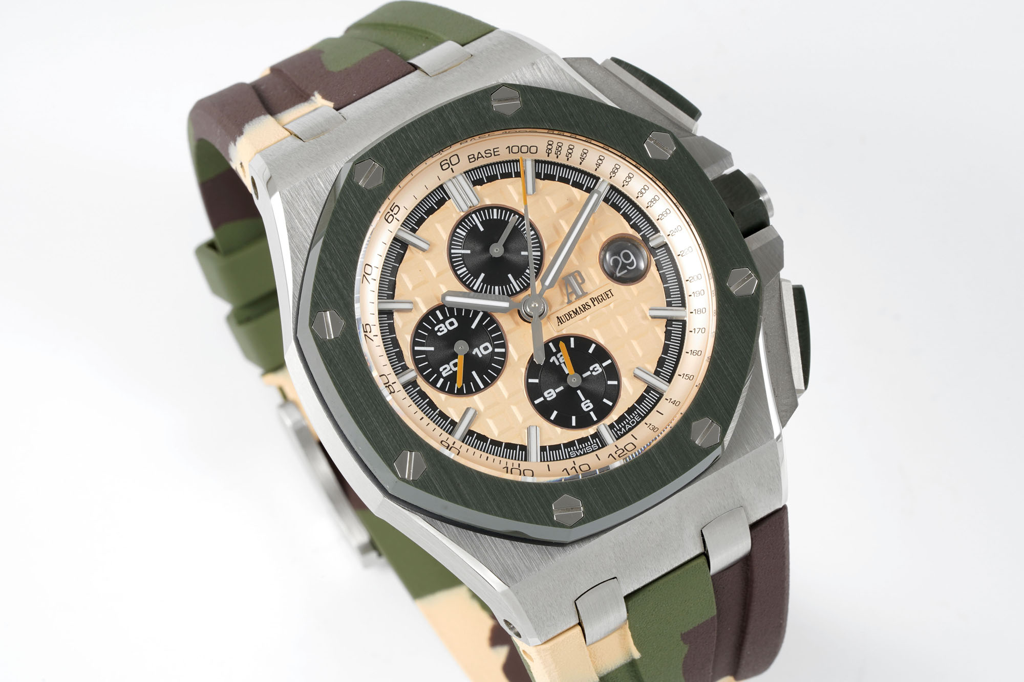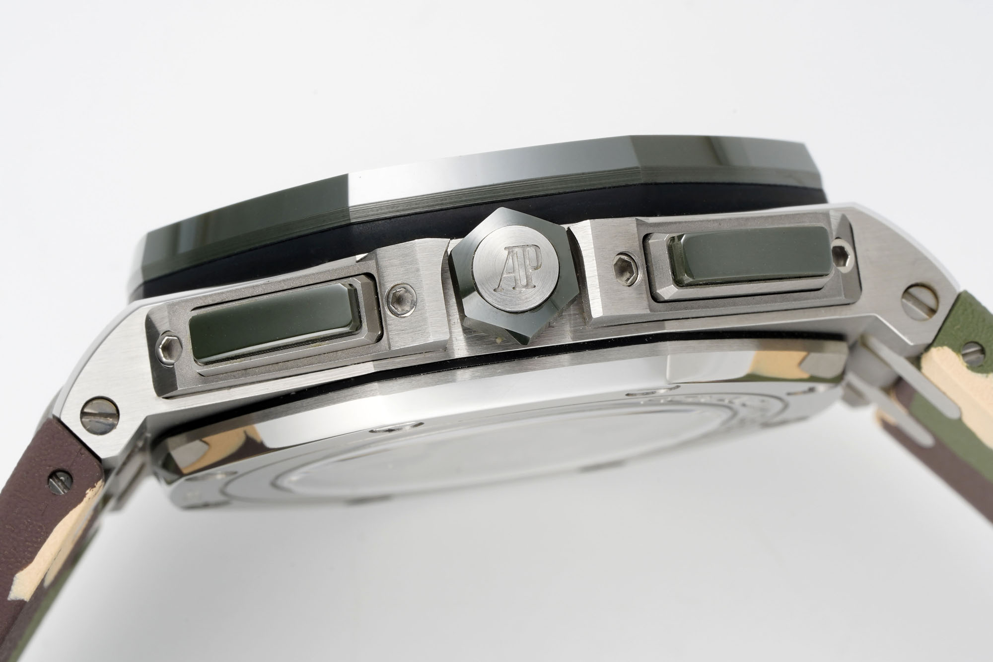 【Dial】The dial has a classic gray-black checkered pattern as the background, with distinct squares that create a sense of depth. The font style on the dial is well-balanced and shows no defects. The three sub-dials are highlighted with white scales above the gray-black case, and the red hands on two of the sub-dials are particularly eye-catching. The small seconds sub-dial is located at twelve o’clock, and there is a circular date window at three o’clock with a multi-faceted magnifying lens decoration. The TPE enlargement effect is consistent with the authentic piece and has a coating on the surface to achieve the effect of clearing data when enlarged. The font style of the date window matches the authentic piece. The sub-dials at six o’clock and nine o’clock are also chronograph sub-dials, and all hour markers on the dial are filled with imported luminescent materials, providing the same luminous effect as the original. The tips of the hands are decorated in red, and the other two hands are clean and neat without any burrs.