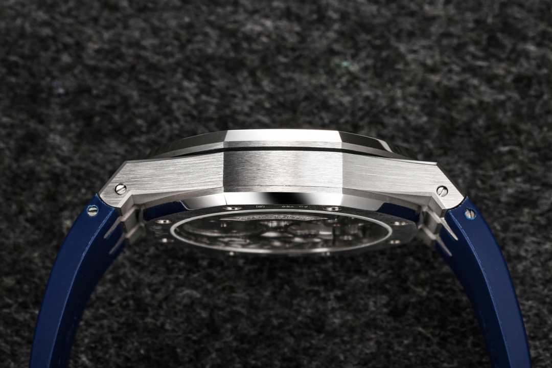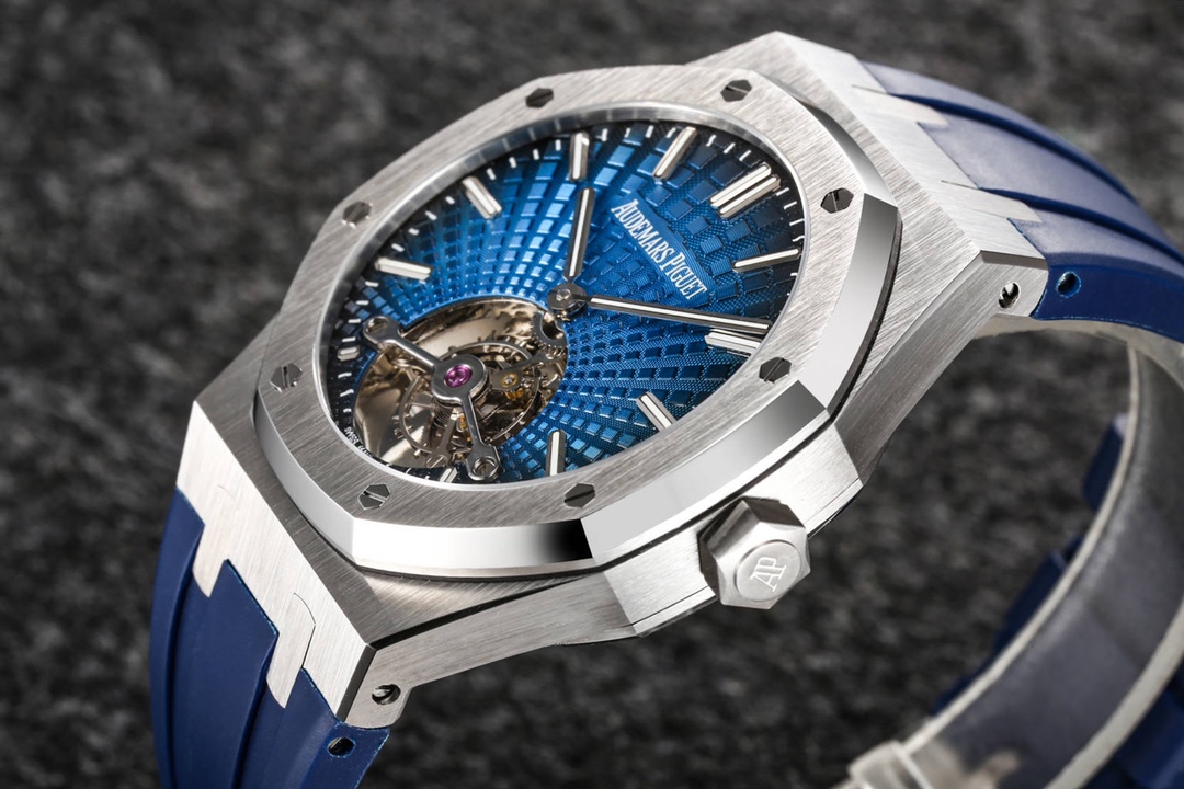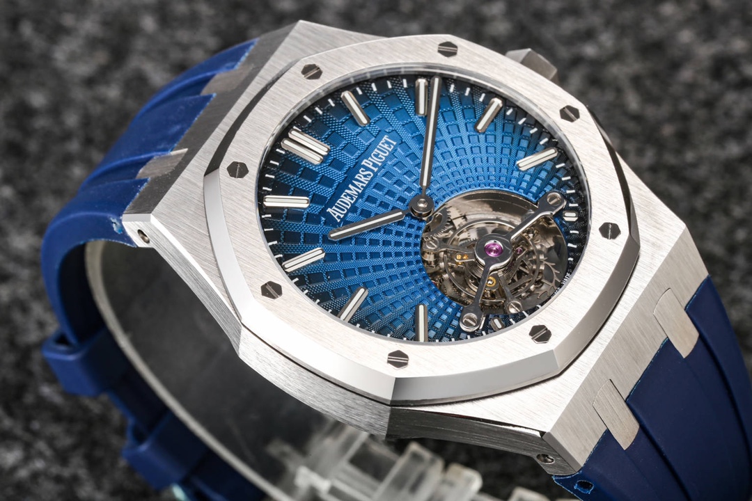 Audemars Piguet continues to lead the way in exploring innovation and unveiled the new Royal Oak Extra-Thin Tourbillon watch at the Geneva exhibition. The iconic “Tapisserie” checkered design has been reimagined into a fresh radiating pattern, offering a new visual experience. The sunburst radiating pattern originates from the tourbillon at 6 o’clock, with the size of the pattern gradually increasing from the center outwards, creating a captivating color gradient effect. The radiating pattern is brilliant and visually stunning. The checkered dial is complemented by white gold fluorescent three-dimensional hands, featuring Swiss superluminova, ensuring clear time visibility even in dark environments, providing great convenience.