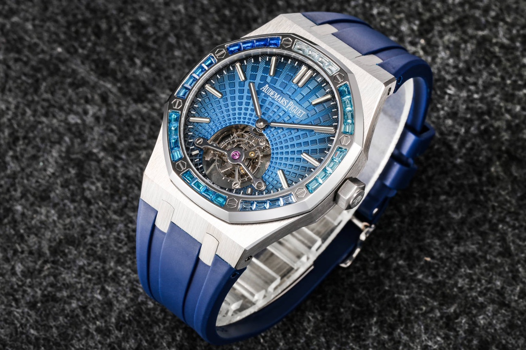 Audemars Piguet continues to lead the way in exploring innovation and unveiled the new Royal Oak Extra-Thin Tourbillon watch at the Geneva exhibition. The iconic “Tapisserie” checkered design has been reimagined into a fresh radiating pattern, offering a new visual experience. The sunburst radiating pattern originates from the tourbillon at 6 o’clock, with the size of the pattern gradually increasing from the center outwards, creating a captivating color gradient effect. The radiating pattern is brilliant and visually stunning. The checkered dial is complemented by white gold fluorescent three-dimensional hands, featuring Swiss superluminova, ensuring clear time visibility even in dark environments, providing great convenience.