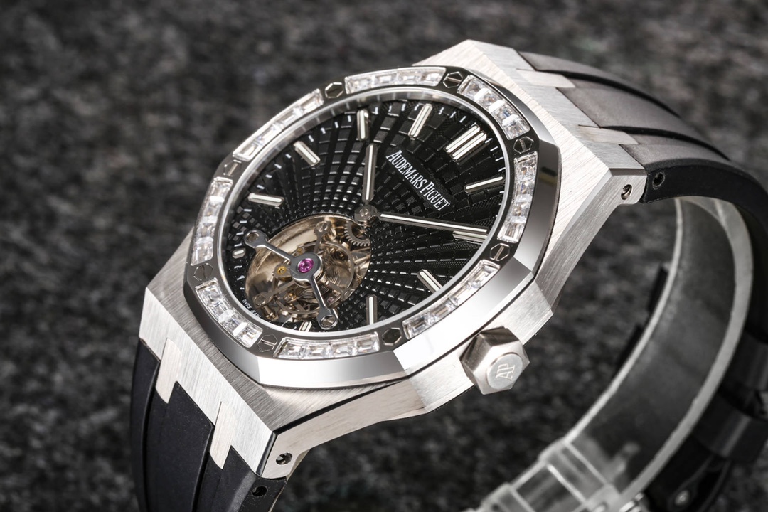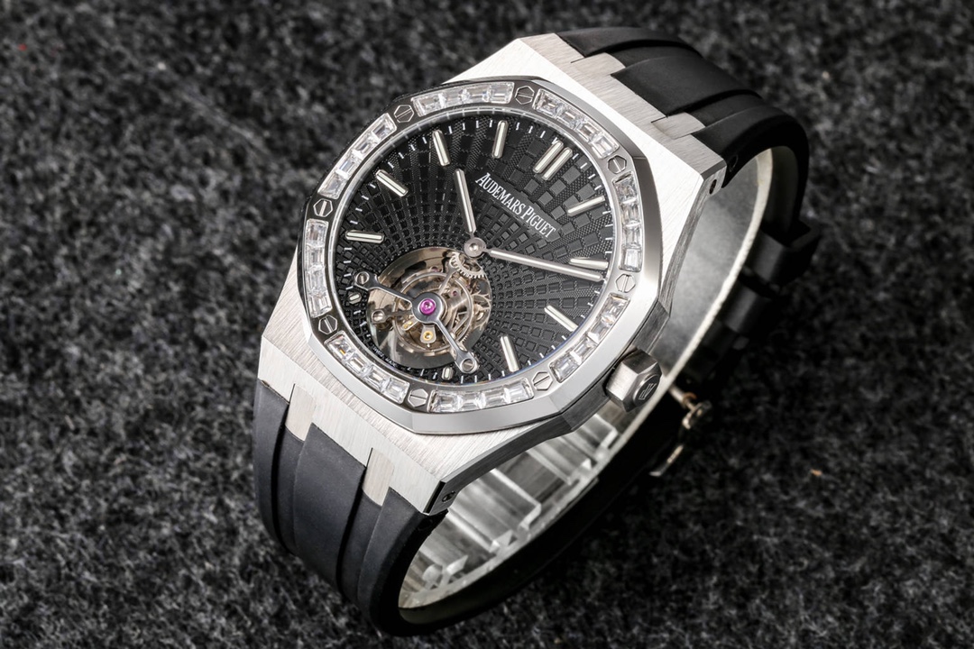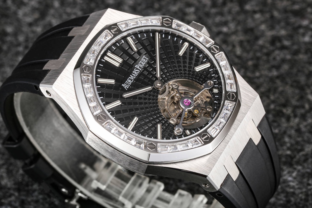 Audemars Piguet continues to lead the way in exploring innovation and unveiled the new Royal Oak Extra-Thin Tourbillon watch at the Geneva exhibition. The iconic “Tapisserie” checkered design has been reimagined into a fresh radiating pattern, offering a new visual experience. The sunburst radiating pattern originates from the tourbillon at 6 o’clock, with the size of the pattern gradually increasing from the center outwards, creating a captivating color gradient effect. The radiating pattern is brilliant and visually stunning. The checkered dial is complemented by white gold fluorescent three-dimensional hands, featuring Swiss superluminova, ensuring clear time visibility even in dark environments, providing great convenience.