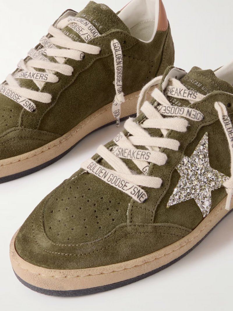 - Army-green suede (Cow), tan leather, gold and silver glittered leather