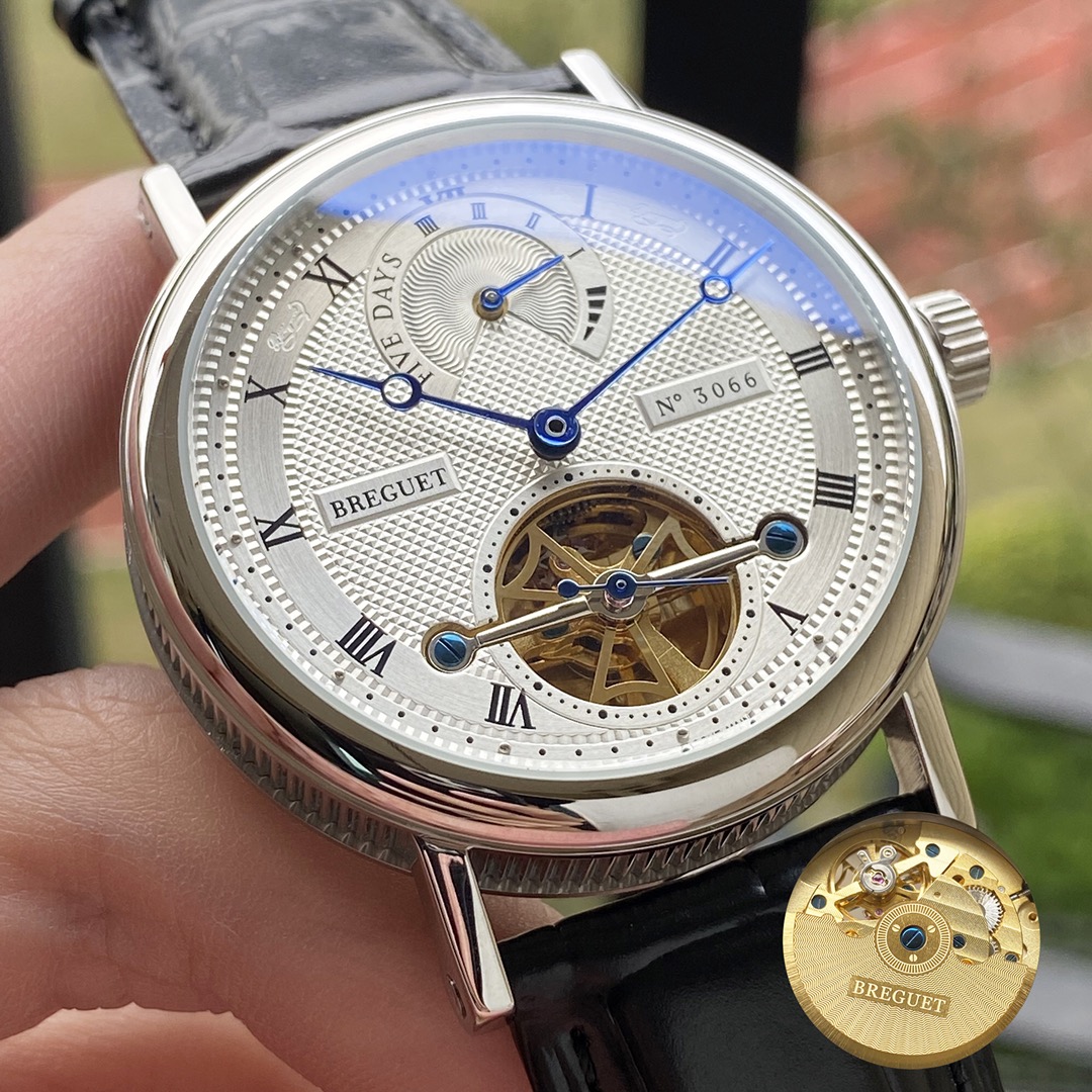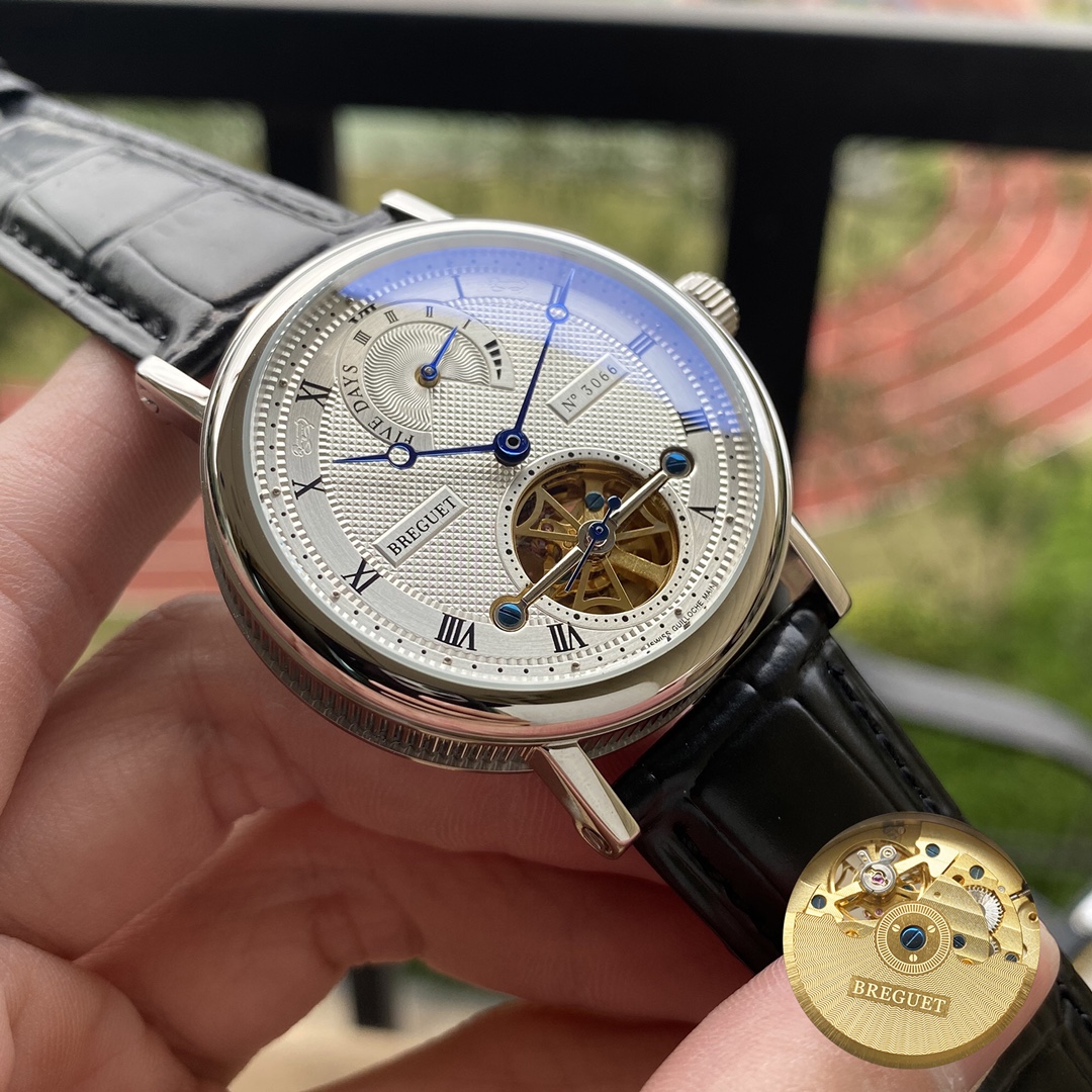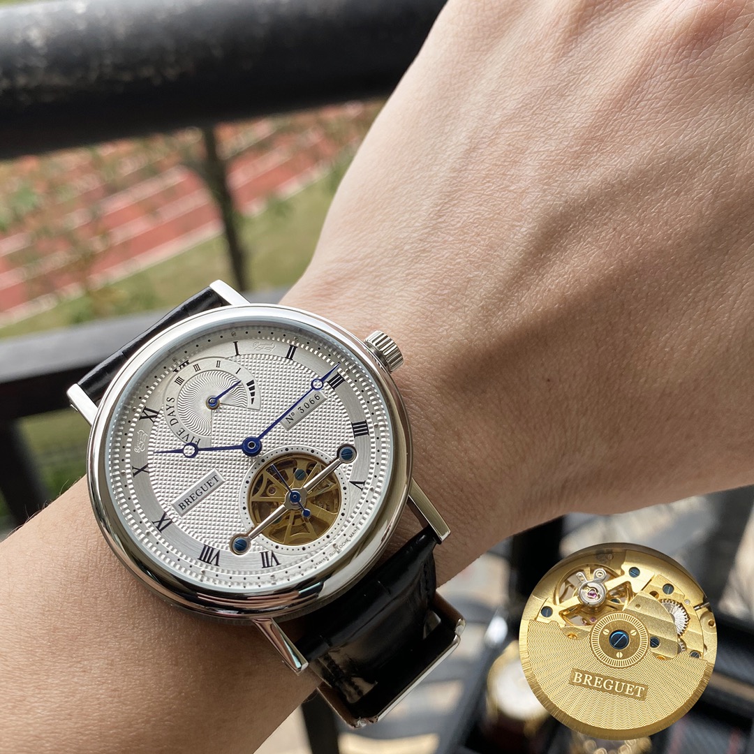 This is a classic Breguet series wristwatch, with a case made of 316L stainless steel, offering superior waterproof performance and excellent water resistance. It is equipped with a top-tier mechanical movement. The strap is made of imported calfskin, resistant to sweat and corrosion. The dial features a highly durable mineral crystal mirror, satisfying your visual enjoyment. The overall case design exhibits a strong three-dimensional sense and exquisite craftsmanship. Dimensions: Diameter 43mm, thickness 14mm.