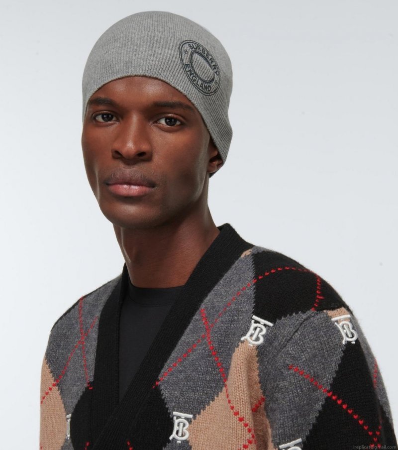 Burberry designs this grey mélange beanie hat, which is detailed with a logo print on the side. It is crafted from a cashmere blend and has a ribbed-knit cuff.