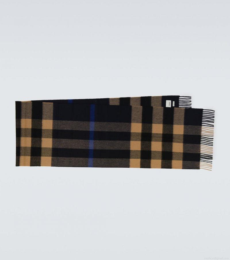 Featuring a large-scale check motif throughout, this indigo blue and camel brown cashmere scarf from Burberry has a soft brushed finish with fringed edges.