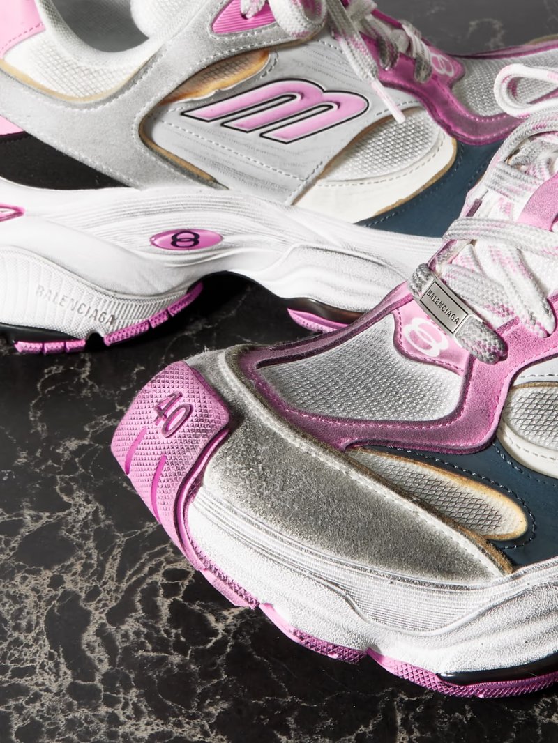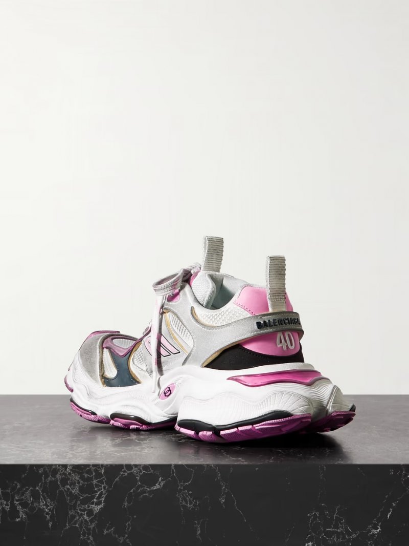 - White and pink rubber, tonal-gray, black and pink faux suede, white mesh