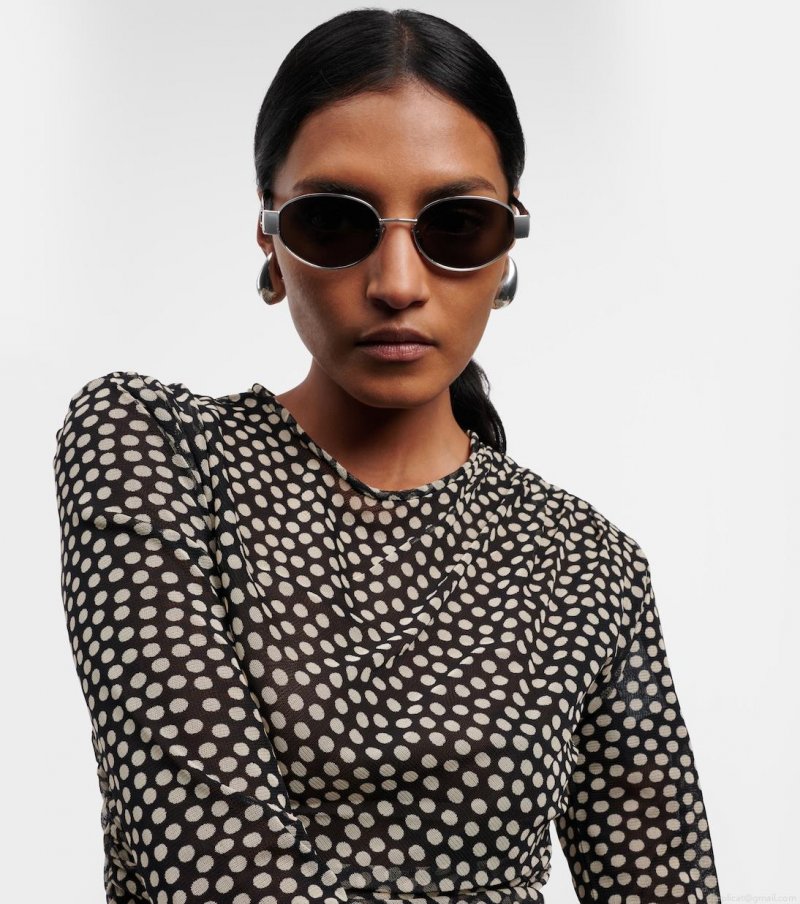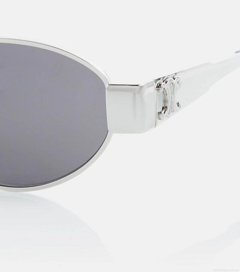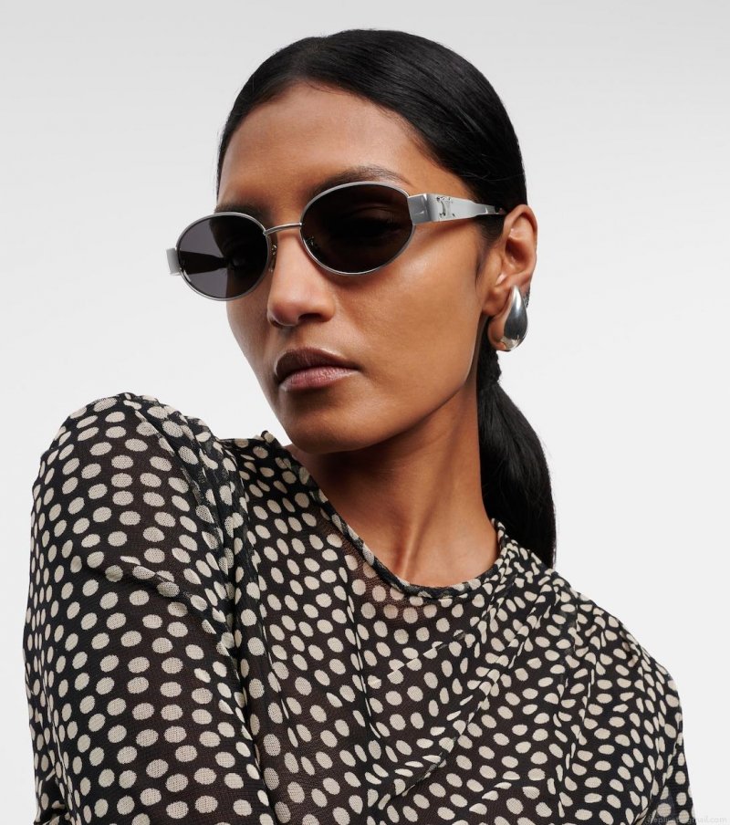 Designed in silver-tinted metal and accented with Triomphe branding, these sunglasses from Celine Eyewear boast a futuristic silhouette. The pair features tonal smoke gray lenses and comes with a brown leather crossbody pouch.