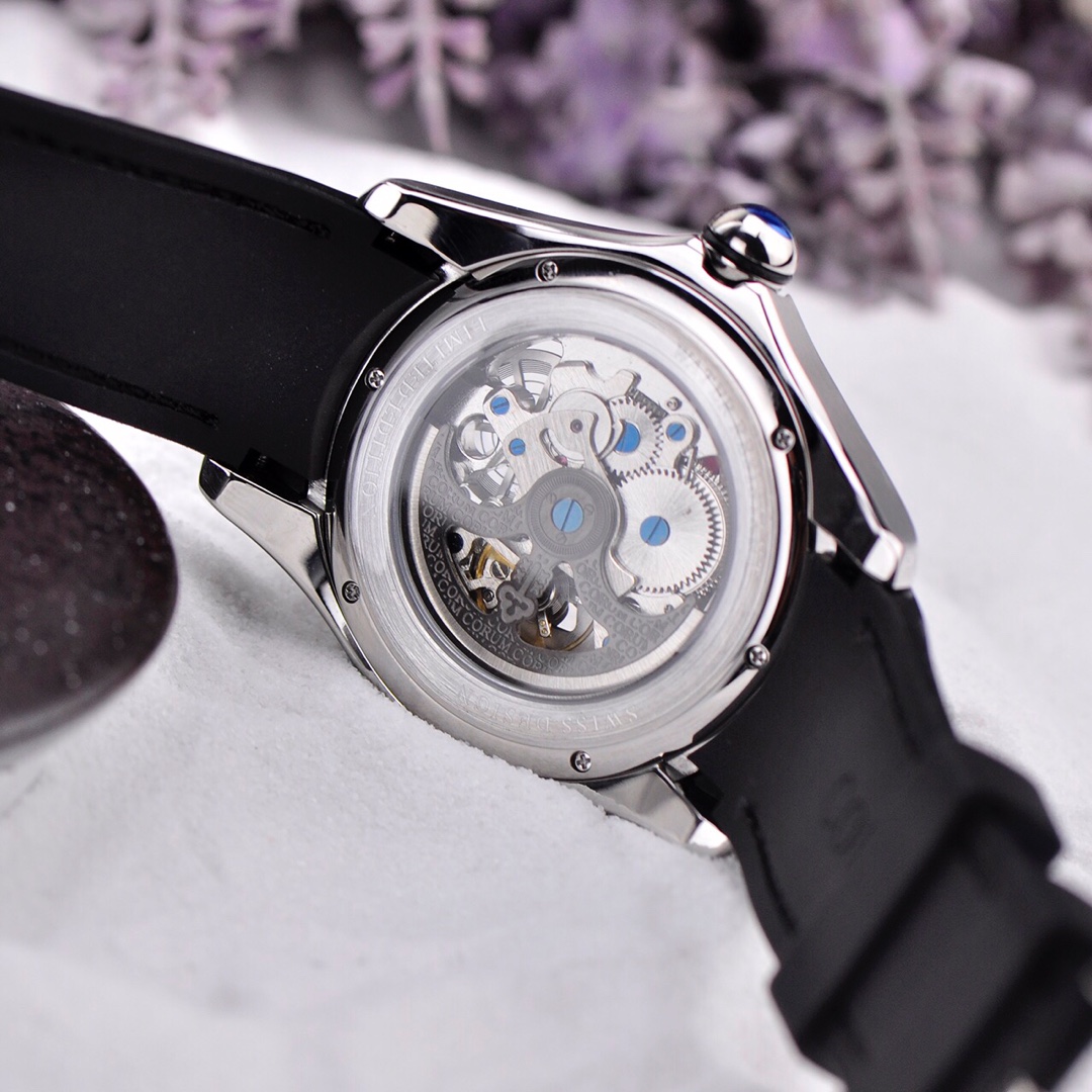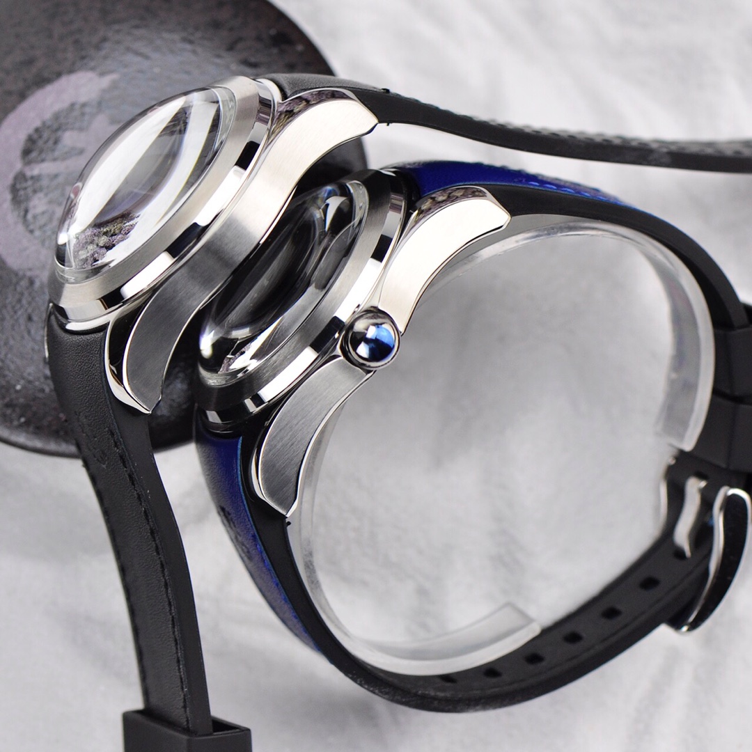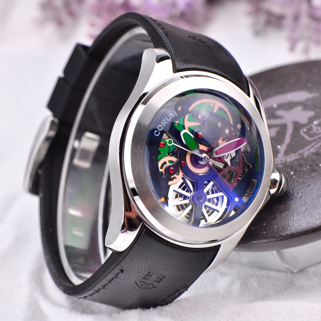 This is a Corum Bubble watch from the Kunlun Bubble series, returning with a brand new colored dial design. The new version of the watch has a diameter expanded to 46mm and features a spherical crown. It has a thickness of 18.8mm, with the crystal alone measuring 8mm. The towering crystal has a magnifying lens function, which can enlarge and distort the visual effect of the dial. The curved case fits closely to the wrist, ensuring the most comfortable wearing experience.