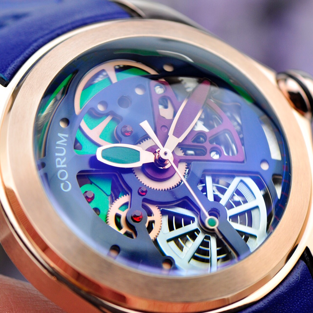 This is a Corum Bubble watch from the Kunlun Bubble series, returning with a brand new colored dial design. The new version of the watch has a diameter expanded to 46mm and features a spherical crown. It has a thickness of 18.8mm, with the crystal alone measuring 8mm. The towering crystal has a magnifying lens function, which can enlarge and distort the visual effect of the dial. The curved case fits closely to the wrist, ensuring the most comfortable wearing experience.
