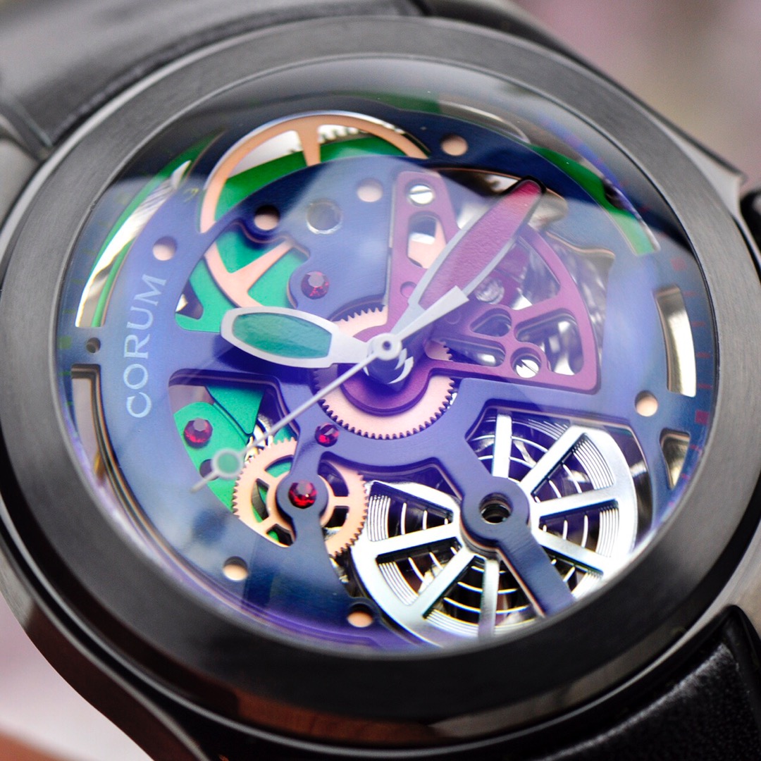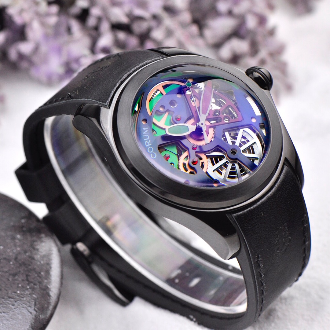 This is a Corum Bubble watch from the Kunlun Bubble series, returning with a brand new colored dial design. The new version of the watch has a diameter expanded to 46mm and features a spherical crown. It has a thickness of 18.8mm, with the crystal alone measuring 8mm. The towering crystal has a magnifying lens function, which can enlarge and distort the visual effect of the dial. The curved case fits closely to the wrist, ensuring the most comfortable wearing experience.