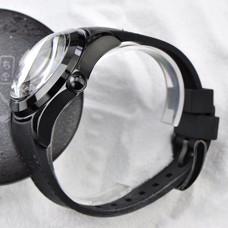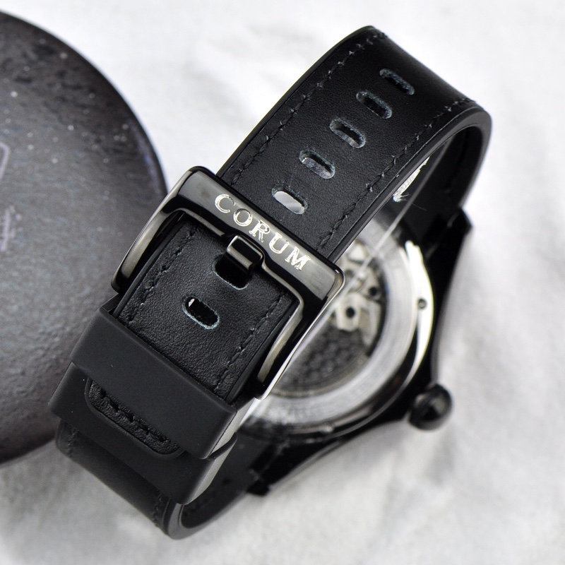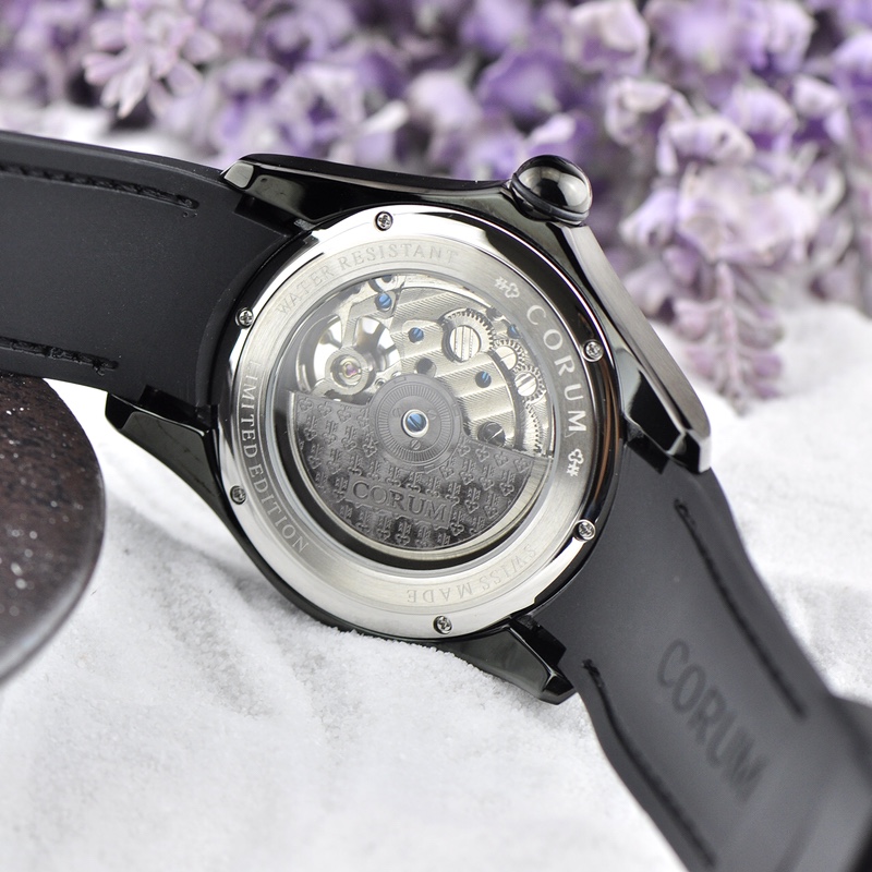 This is the CORUM Bubble series 46mm floating tourbillon watch. The mysterious skull totem on the dial, surrounded by a shiny and vibrant rose gold case, with the deep hollow eye sockets of the skull gazing at the wearer. The open jaw of the skull houses a floating tourbillon, as if piercing through the sharply defined skull, showcasing the fascinating top-level watchmaking craftsmanship and the micro-mechanical world of CORUM. The arched anti-reflective coated sapphire crystal, paired with a black glossy leather strap, directs the focus to the skull pattern, creating a striking and unforgettable presence on the wrist, exuding a sense of hidden elegance.