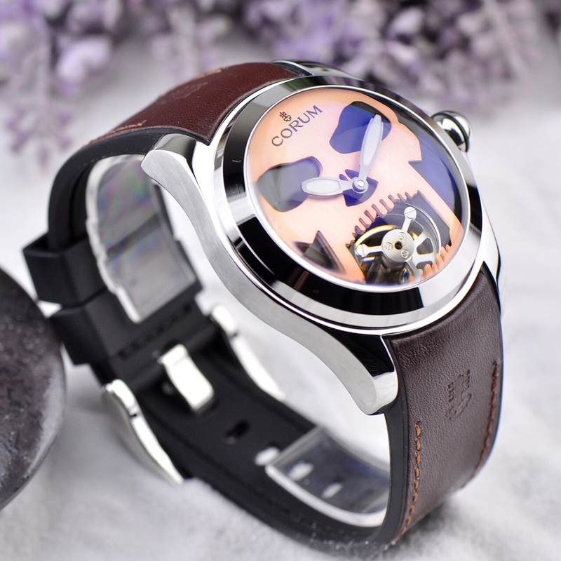 This is the CORUM Bubble series 46mm floating tourbillon watch. The mysterious skull totem on the dial, surrounded by a shiny and vibrant rose gold case, with the deep hollow eye sockets of the skull gazing at the wearer. The open jaw of the skull houses a floating tourbillon, as if piercing through the sharply defined skull, showcasing the fascinating top-level watchmaking craftsmanship and the micro-mechanical world of CORUM. The arched anti-reflective coated sapphire crystal, paired with a black glossy leather strap, directs the focus to the skull pattern, creating a striking and unforgettable presence on the wrist, exuding a sense of hidden elegance.