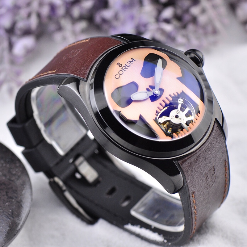 This is the CORUM Bubble series 46mm floating tourbillon watch. The mysterious skull totem on the dial, surrounded by a shiny and vibrant rose gold case, with the deep hollow eye sockets of the skull gazing at the wearer. The open jaw of the skull houses a floating tourbillon, as if piercing through the sharply defined skull, showcasing the fascinating top-level watchmaking craftsmanship and the micro-mechanical world of CORUM. The arched anti-reflective coated sapphire crystal, paired with a black glossy leather strap, directs the focus to the skull pattern, creating a striking and unforgettable presence on the wrist, exuding a sense of hidden elegance.