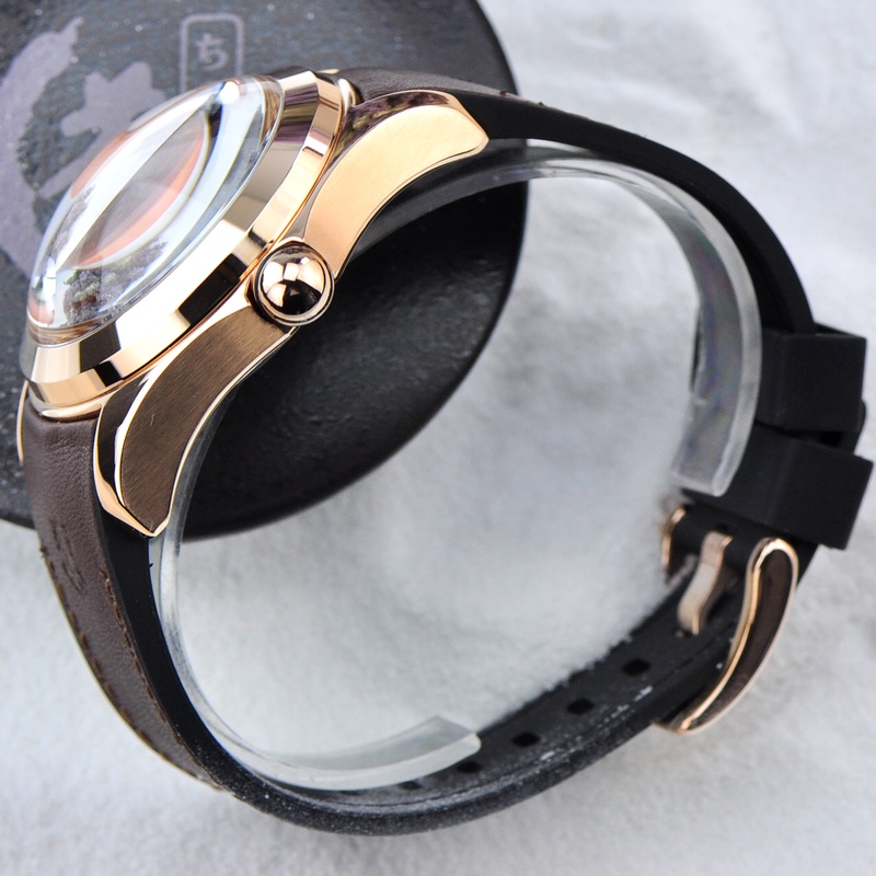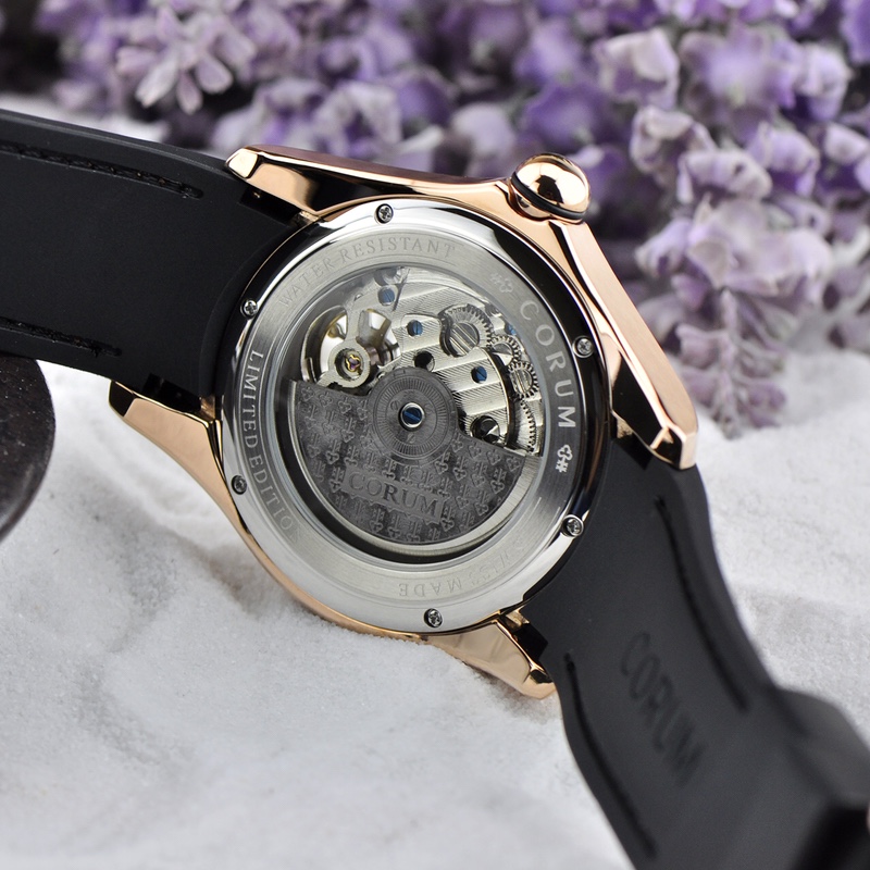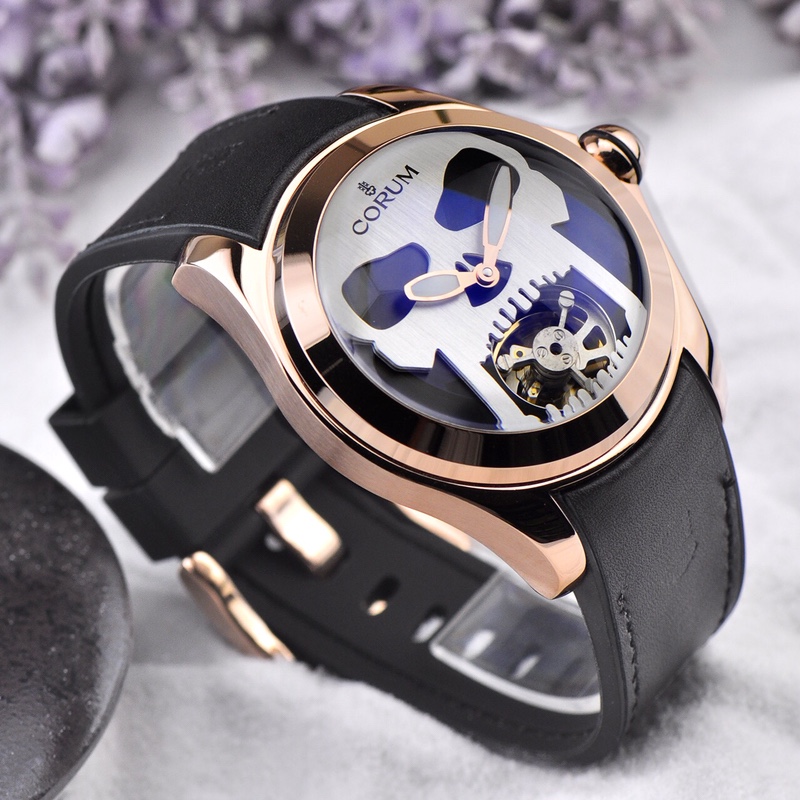 This is the CORUM Bubble series 46mm floating tourbillon watch. The mysterious skull totem on the dial, surrounded by a shiny and vibrant rose gold case, with the deep hollow eye sockets of the skull gazing at the wearer. The open jaw of the skull houses a floating tourbillon, as if piercing through the sharply defined skull, showcasing the fascinating top-level watchmaking craftsmanship and the micro-mechanical world of CORUM. The arched anti-reflective coated sapphire crystal, paired with a black glossy leather strap, directs the focus to the skull pattern, creating a striking and unforgettable presence on the wrist, exuding a sense of hidden elegance.