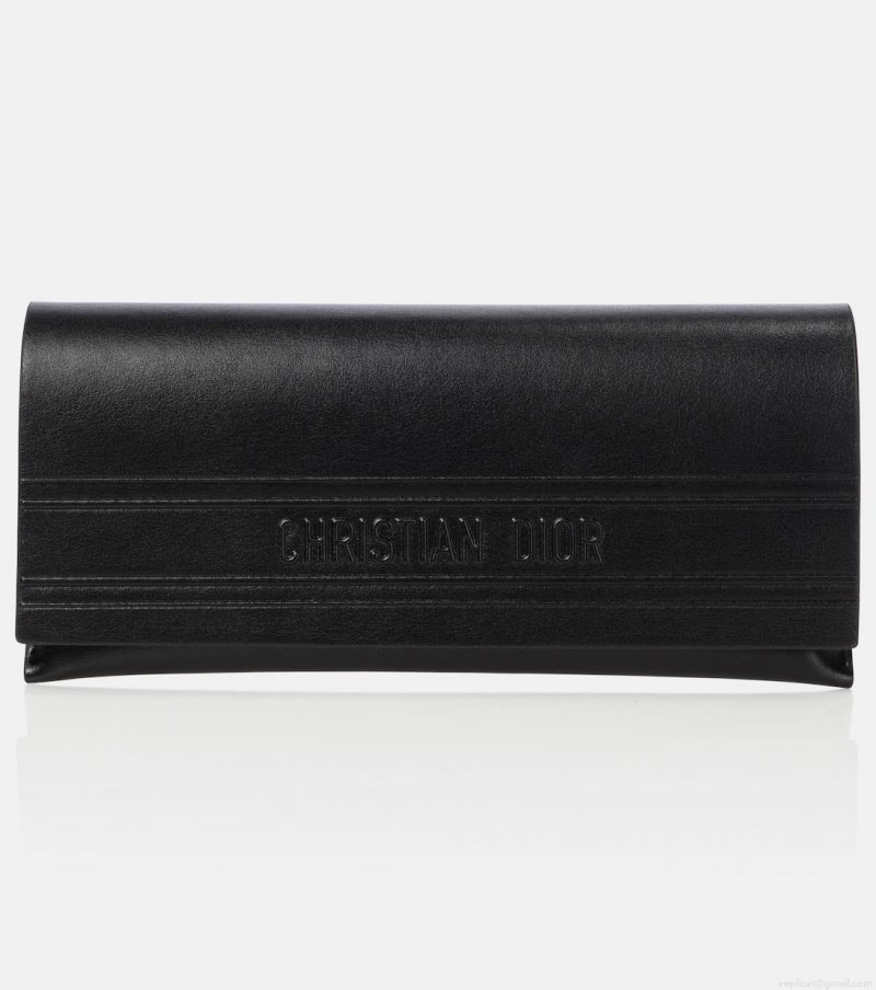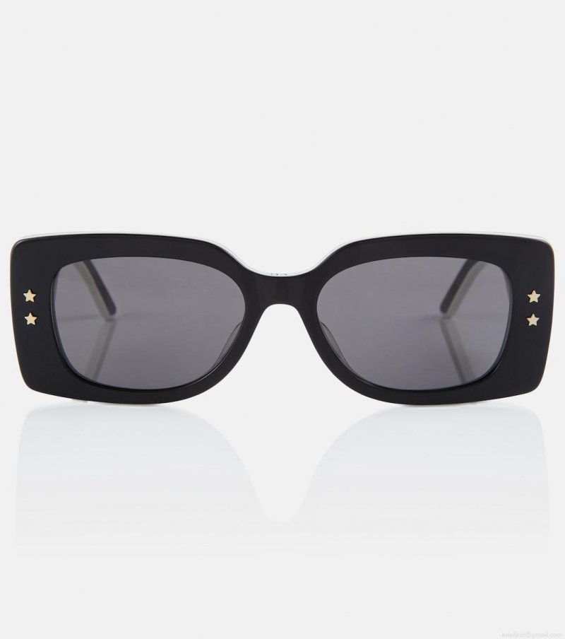 The DiorPacific B1U sunglasses have a distinctive geometric shape with white-edged black acetate frames and golden star accents. They're finished with bold Dior Eyewear lettering on the temples.