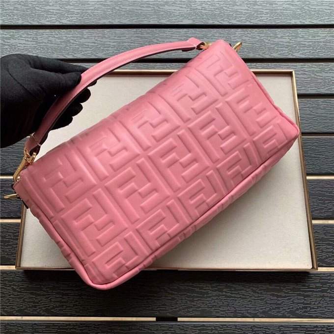 Iconic Baguette bag in large size, with flap and FF fastening with magnetic clasp. Lining with zip pocket. Can be carried by hand or worn cross-body thanks to its handle and shoulder strap, both detachable. Made of white lambskin with an all-over FF motif in a soft, three-dimensional texture. Gold-finish metalware.
