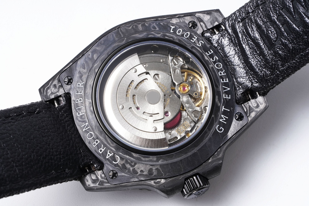 Bezel and Case: The watch features a bezel and case made of carbon fiber, which is not only lightweight and durable but also exhibits a modern technological feel and a unique appearance.