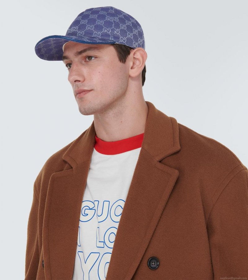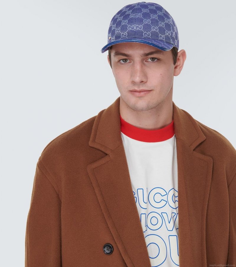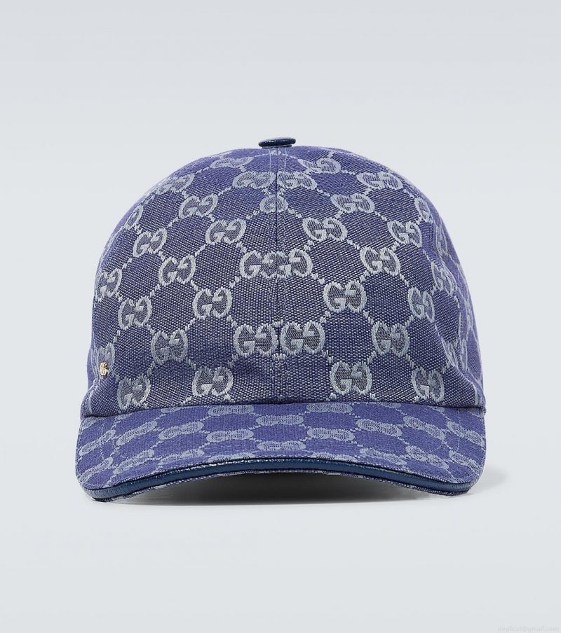 Protect yourself from the sun in style with this baseball cap from Gucci. The style is made from blue-and-grey GG cotton canvas with leather trims and finished with an adjustable strap at the back.