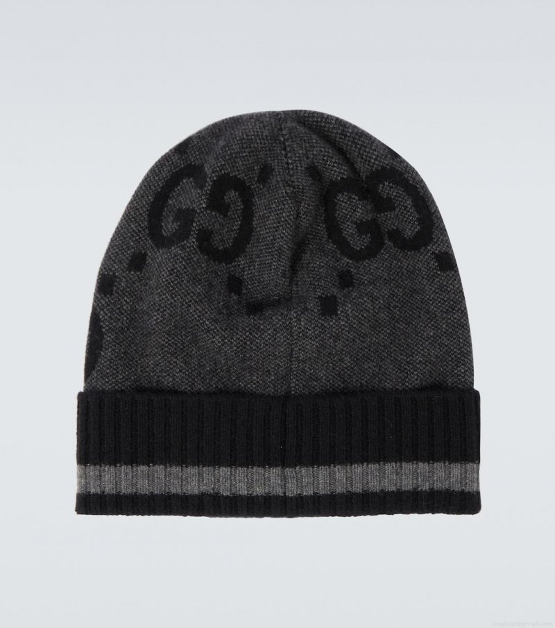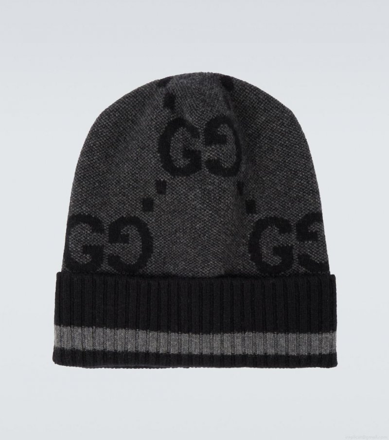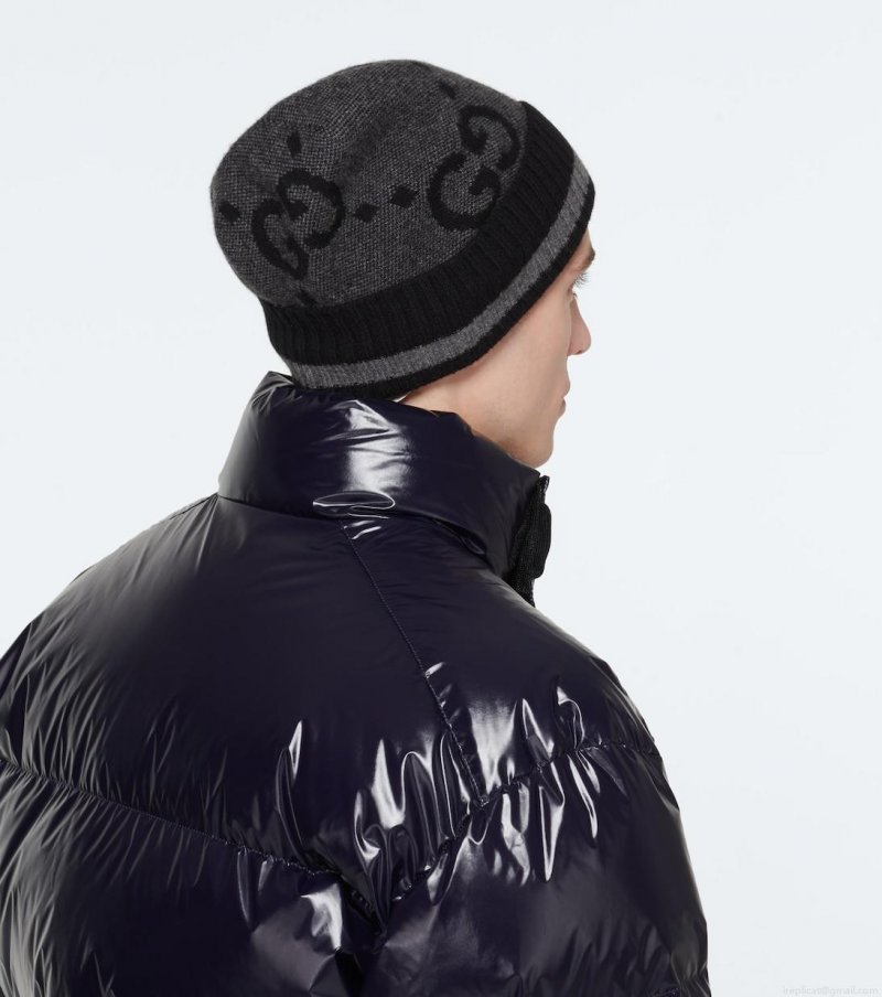Knit from pure cashmere in black and grey, this GG jacquard hat from the Gucci Aria collection has a black cuffed edge with a grey stripe detail.