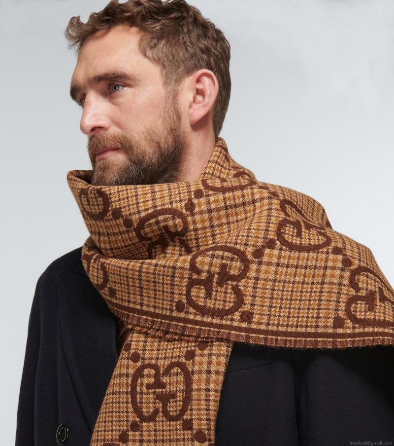 Knit from 100% wool, this scarf from Gucci features the label's GG motif all-over in a jacquard design, and comes in a brown and beige colorway.
