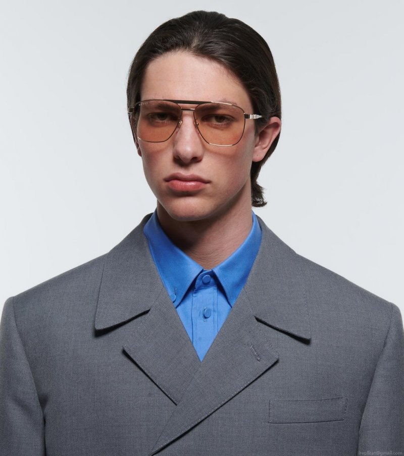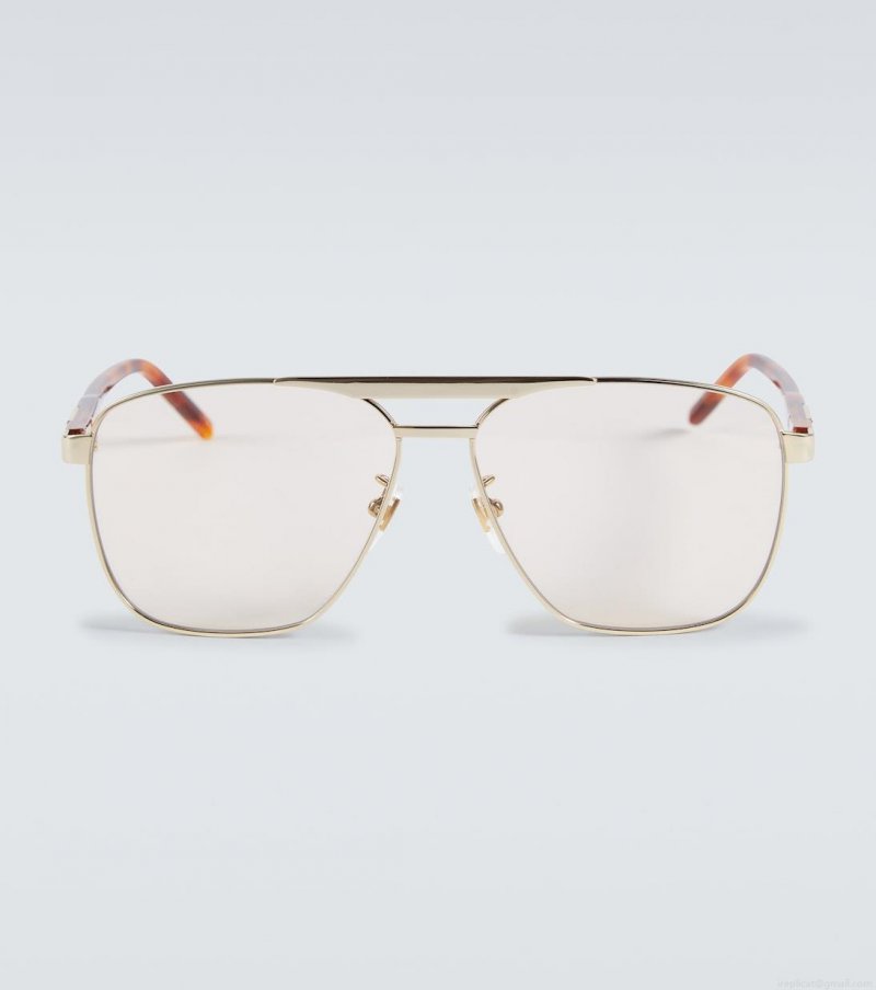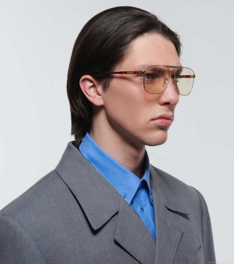 In an aviator-inspired silhouette, these sunglasses from Gucci are crafted in Italy from gold-tone metal, feature brown-tinted lenses, and have beige acetate tips.