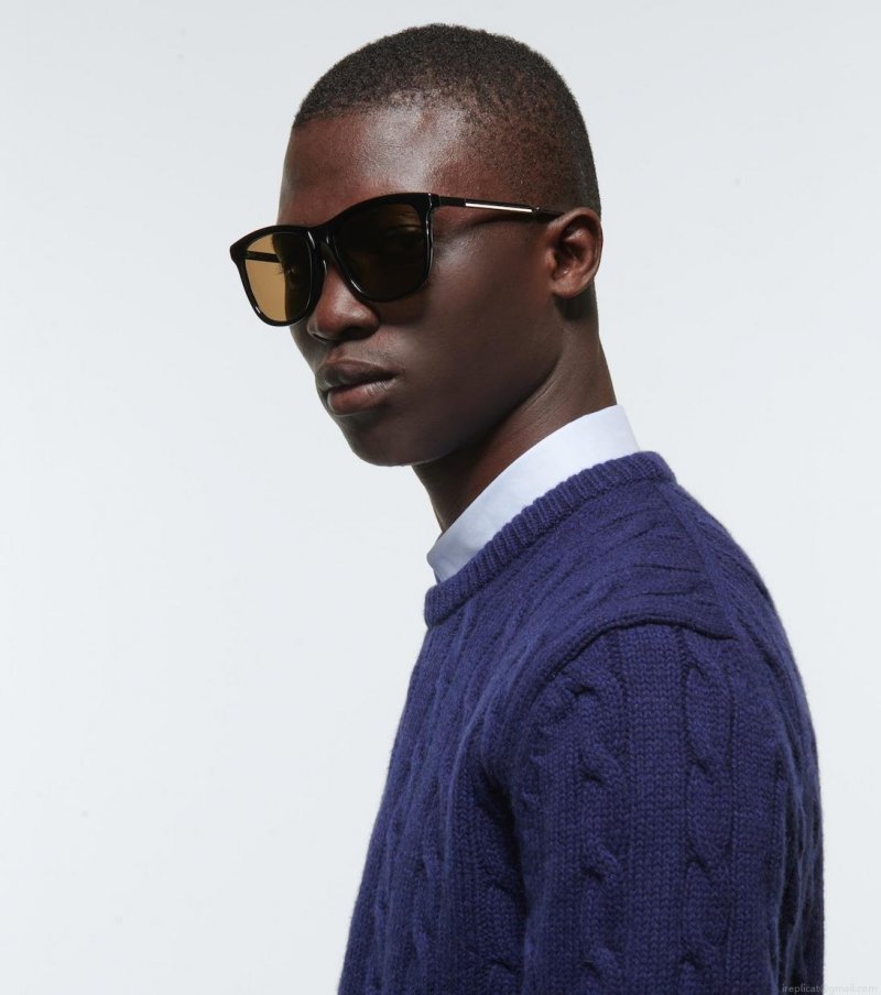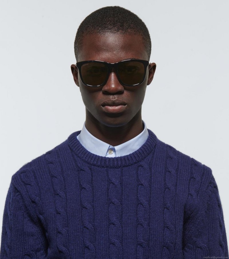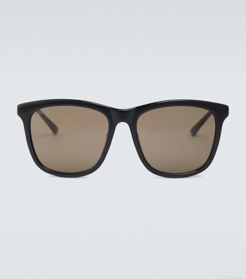 These black acetate sunglasses from Gucci have brown-tinted lenses, an engraved logo on the temples, and come with an assorted colored velvet hard case.