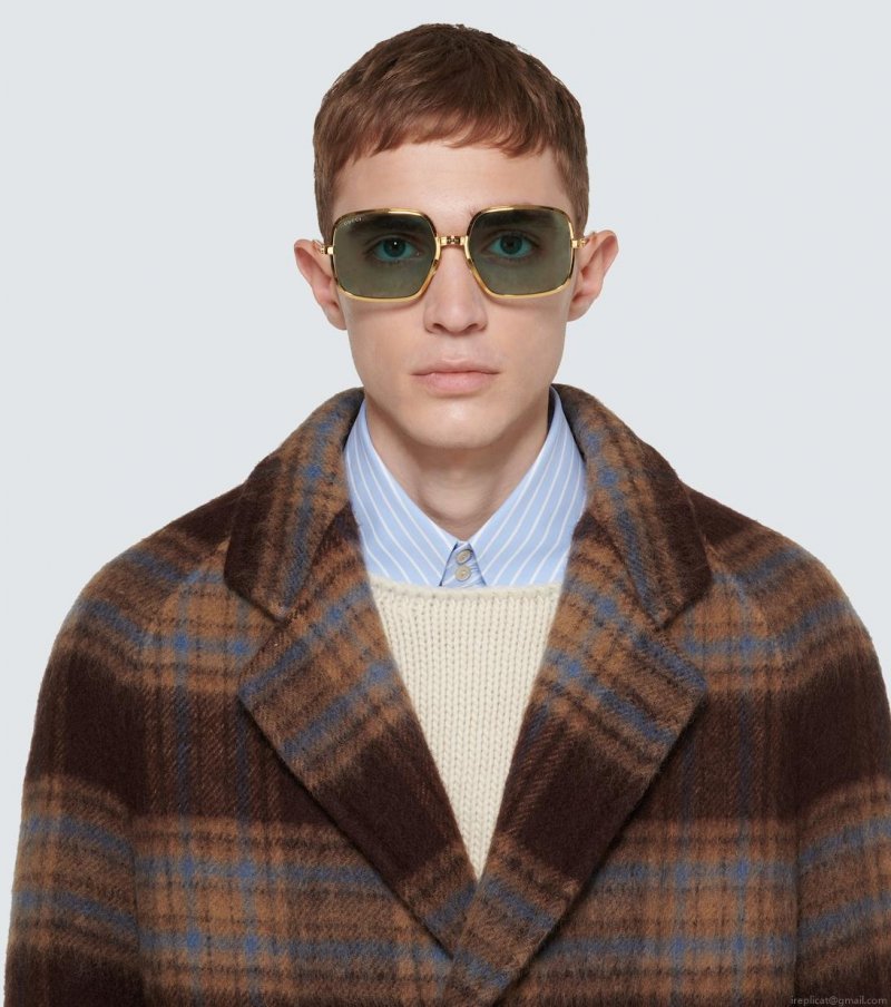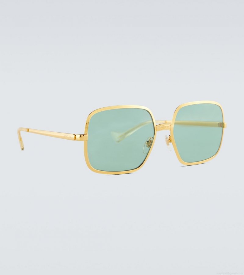 These square-frame sunglasses from Gucci have golden metal frames, green tinted lenses, and are made in Japan. This pair comes in a colored carrying case, the color of which may vary from that as shown in the image.