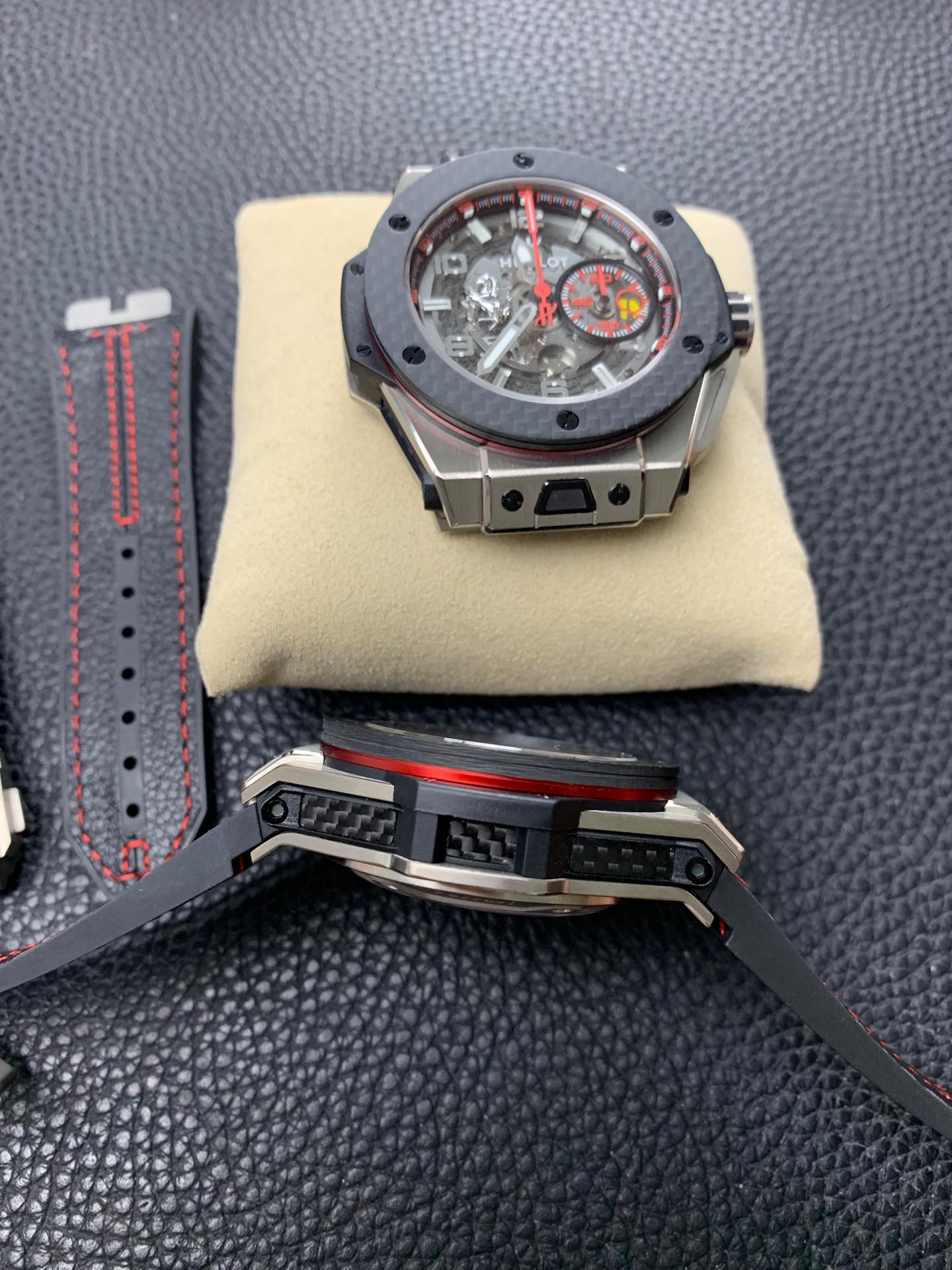 Black PVD-coated titanium bezel screws with a carbon fiber bezel