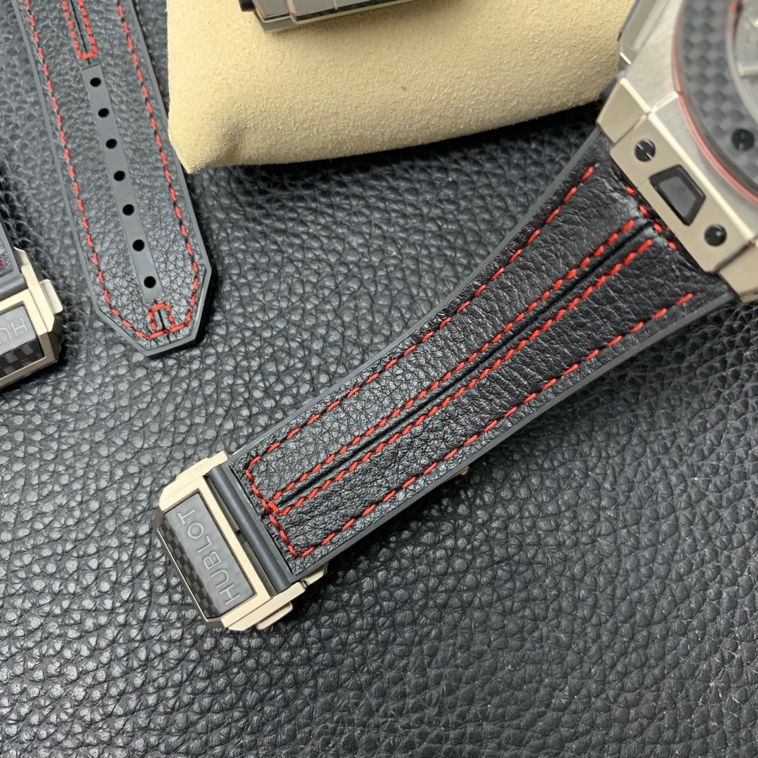 One-click detachable rubber strap with stitched calfskin on the front