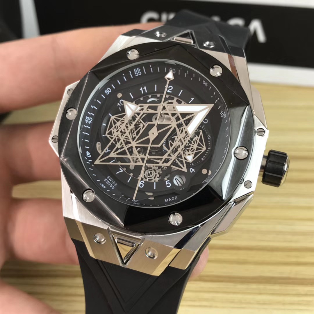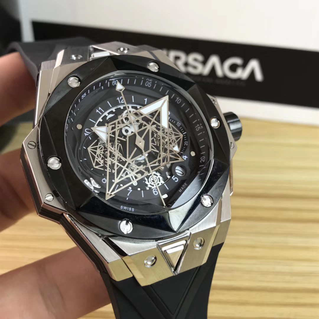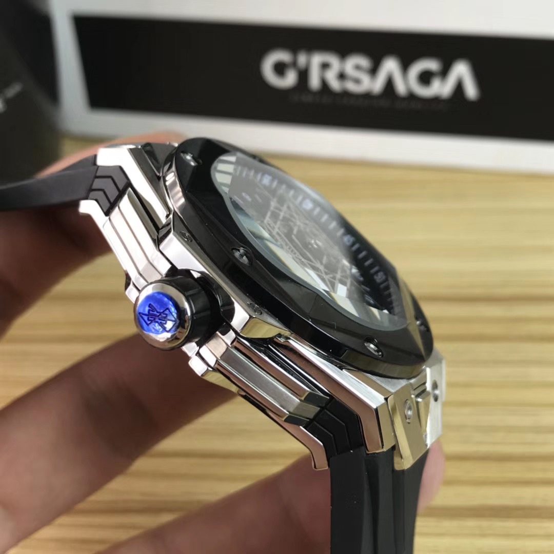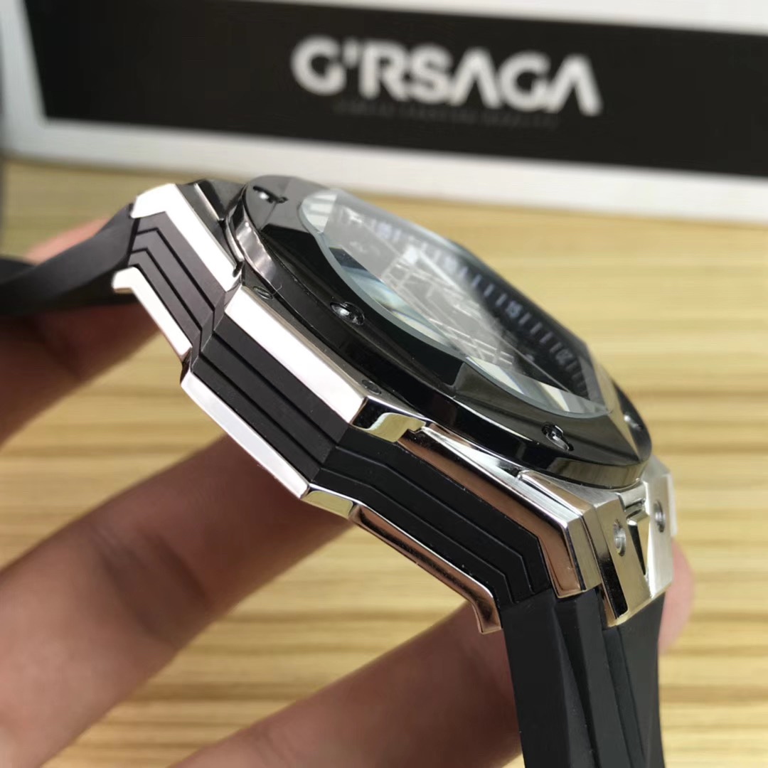 1. 45mm case diameter with graphic elements integrated into the hexagonal bezel through cutting and carving. The bezel is secured by 6 H-shaped titanium screws. The lugs of the watch have a strong design sense with steep angles and bold lines.