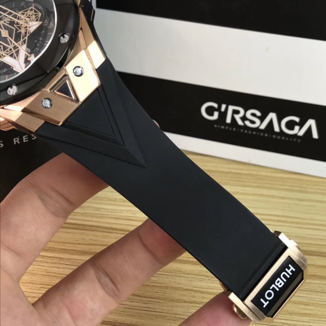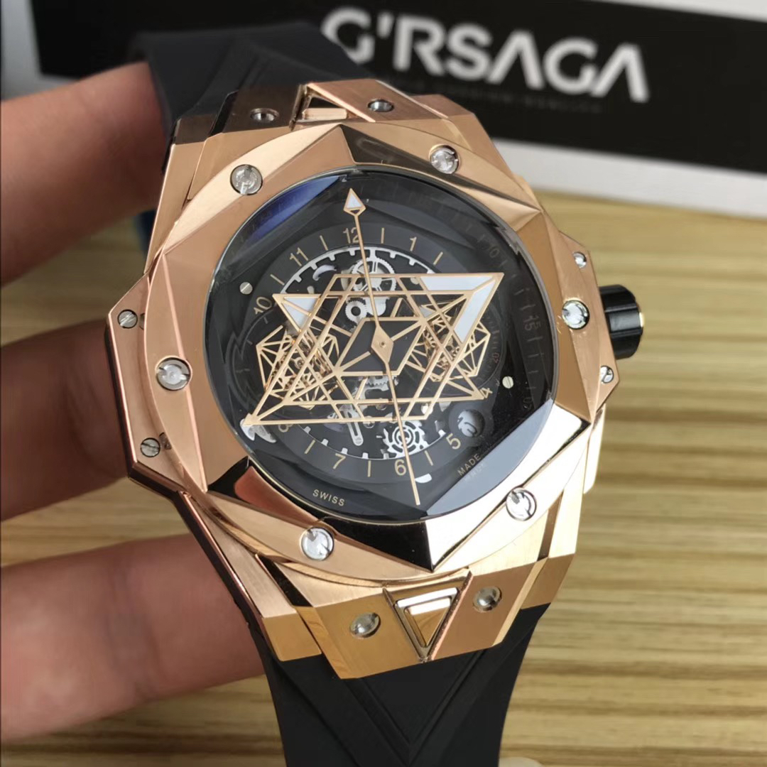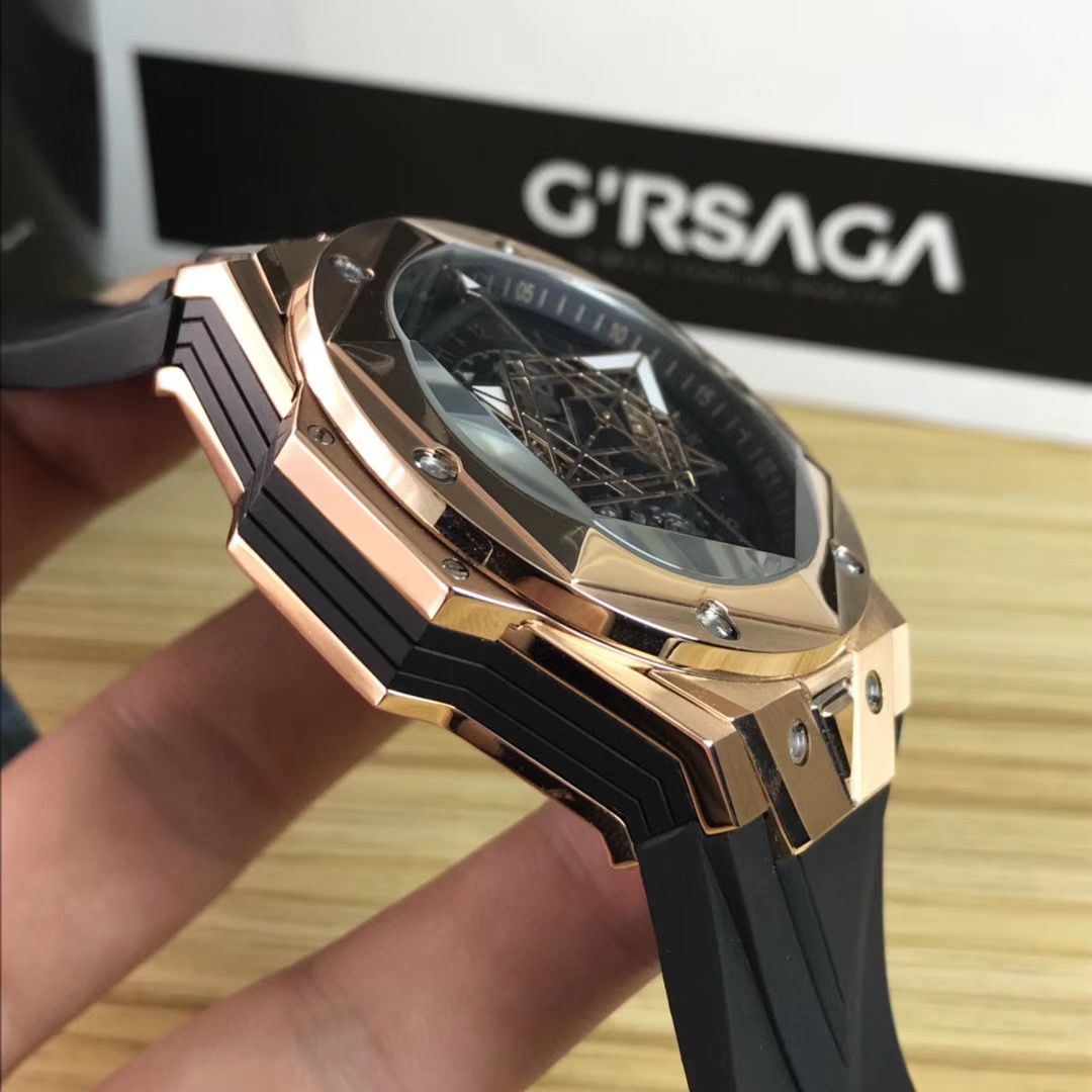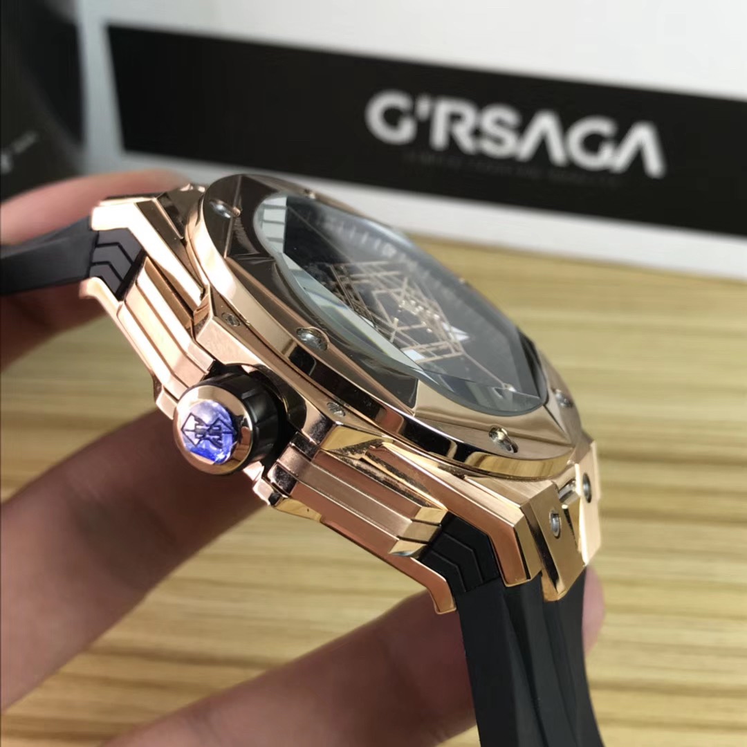 1. 45mm case diameter with graphic elements integrated into the hexagonal bezel through cutting and carving. The bezel is secured by 6 H-shaped titanium screws. The lugs of the watch have a strong design sense with steep angles and bold lines.