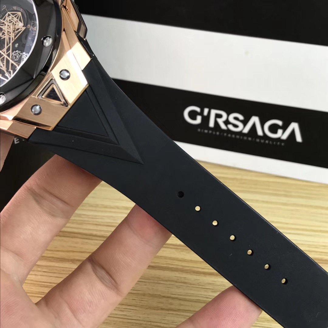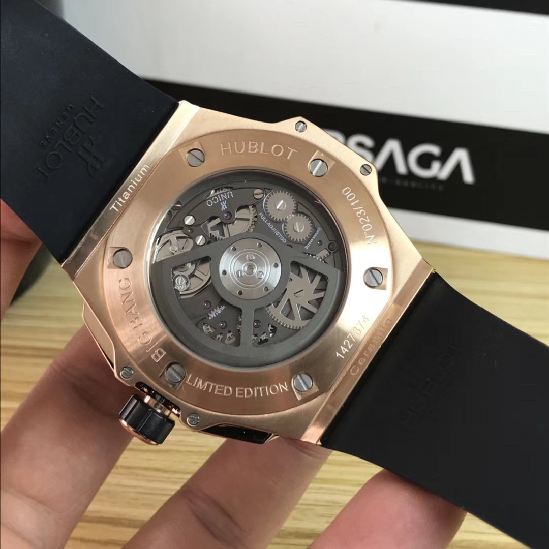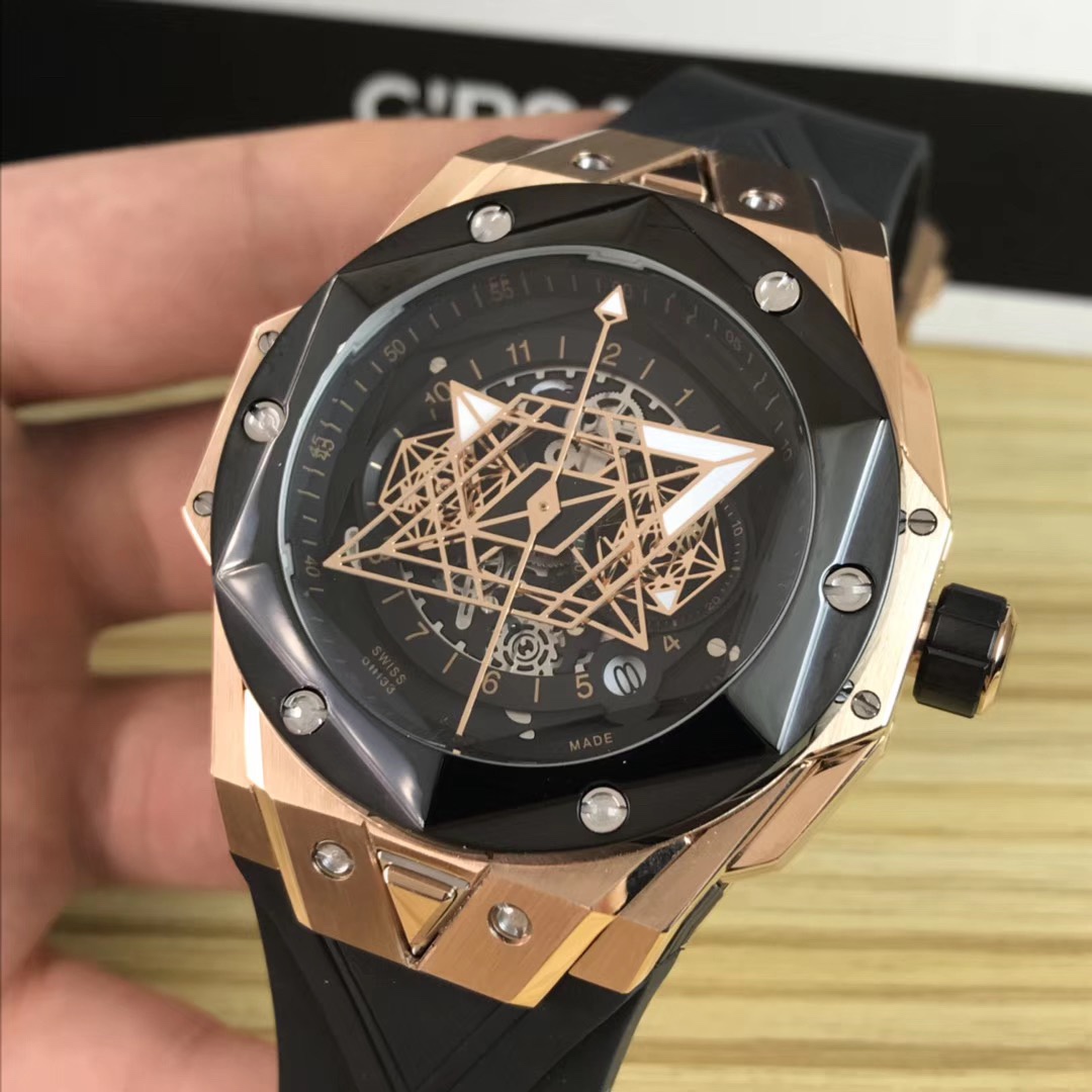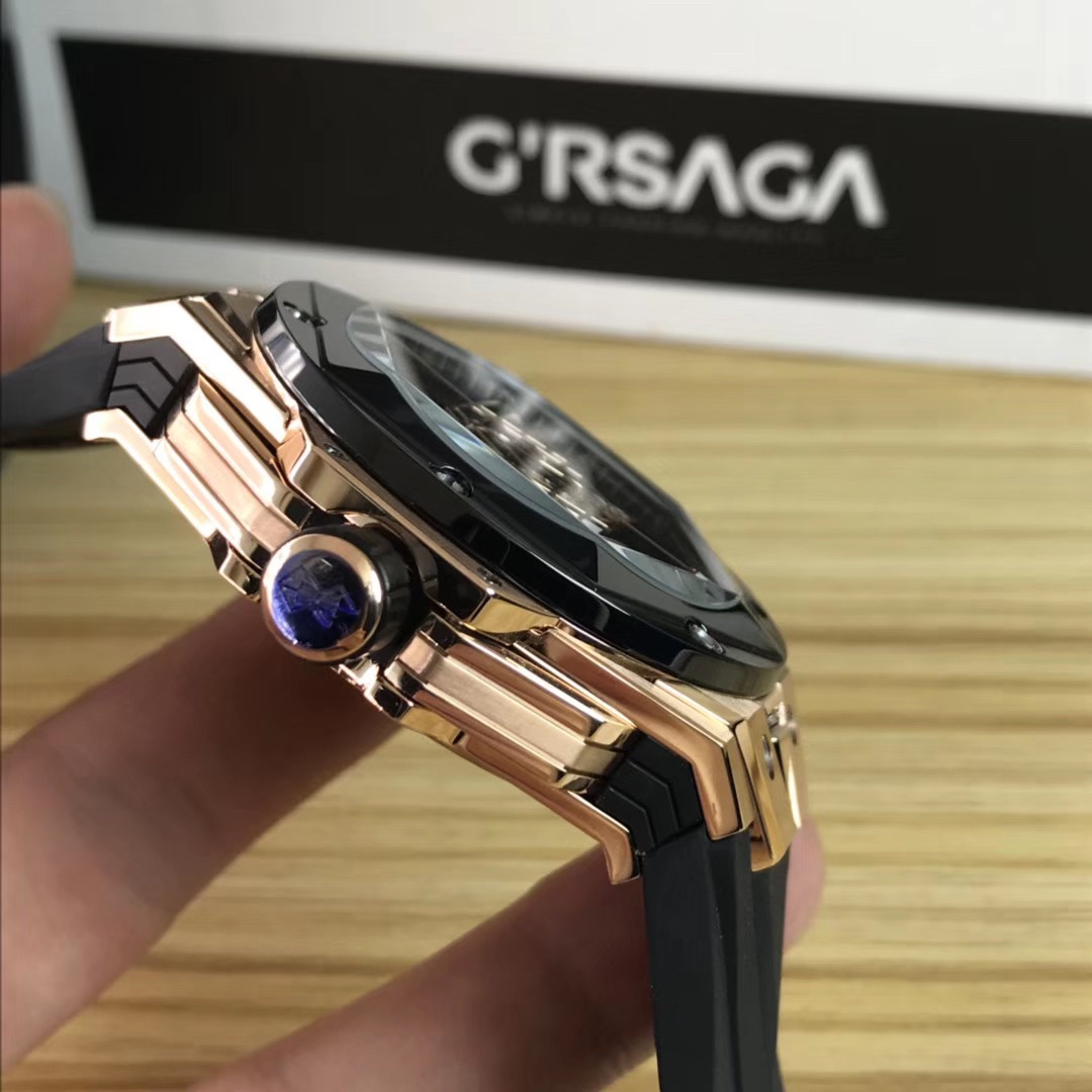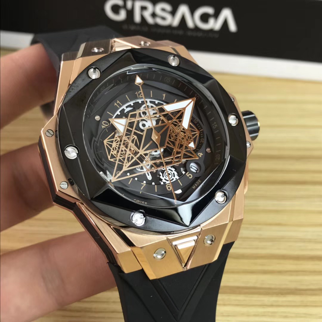 1. 45mm case diameter with graphic elements integrated into the hexagonal bezel through cutting and carving. The bezel is secured by 6 H-shaped titanium screws. The lugs of the watch have a strong design sense with steep angles and bold lines.