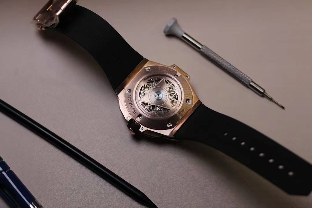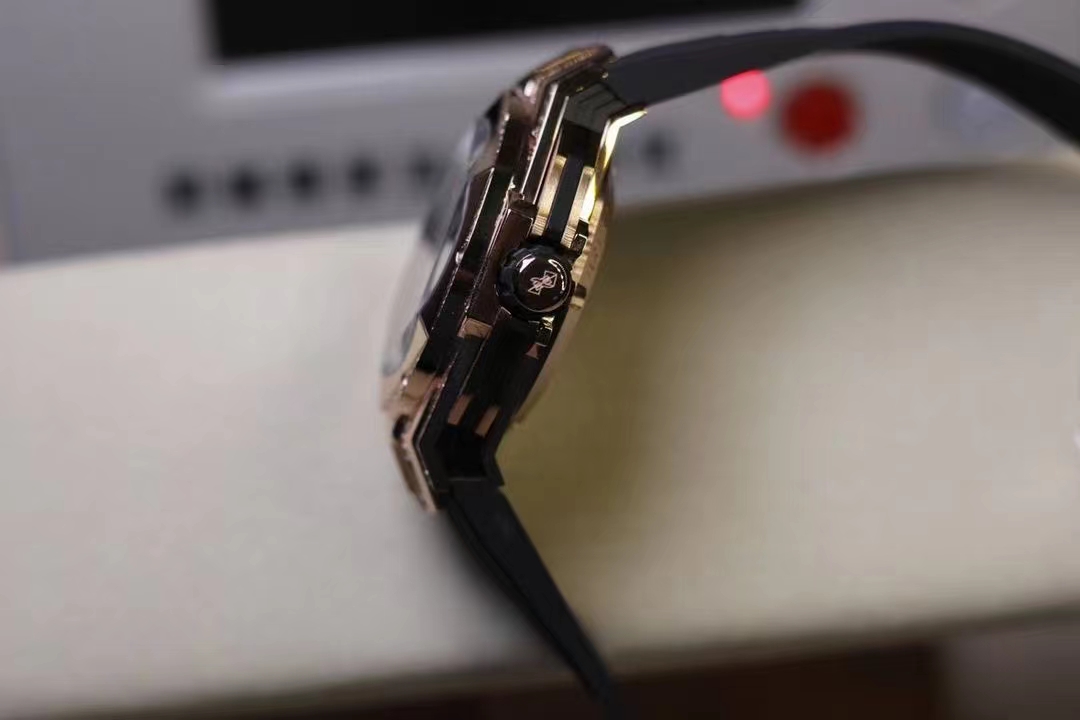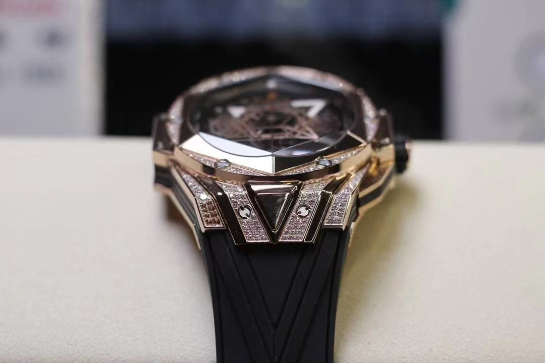 1. 45mm case diameter with graphic elements integrated into the hexagonal bezel through cutting and carving. The bezel is secured by 6 H-shaped titanium screws. The lugs of the watch have a strong design sense with steep angles and bold lines.
