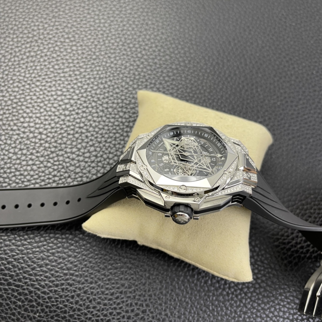 1. 45mm case diameter with graphic elements integrated into the hexagonal bezel through cutting and carving. The bezel is secured by 6 H-shaped titanium screws. The lugs of the watch have a strong design sense with steep angles and bold lines.