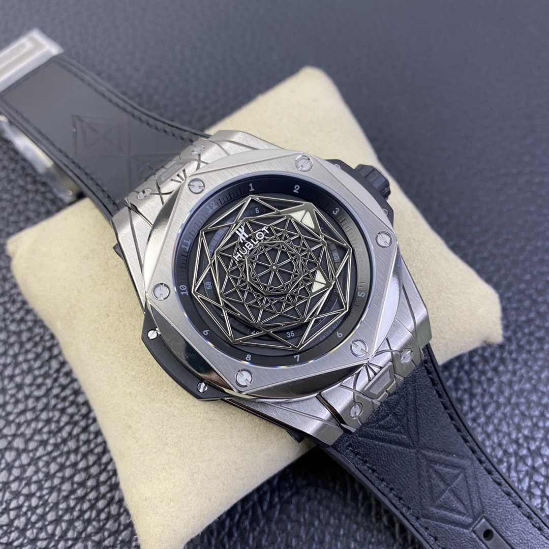 1. 45mm case diameter with graphic elements integrated into the hexagonal bezel through cutting and carving. The bezel is secured by 6 H-shaped titanium screws. The lugs of the watch have a strong design sense with steep angles and bold lines.