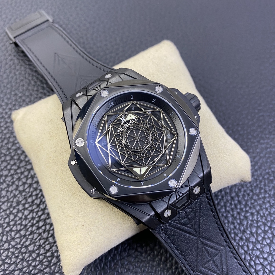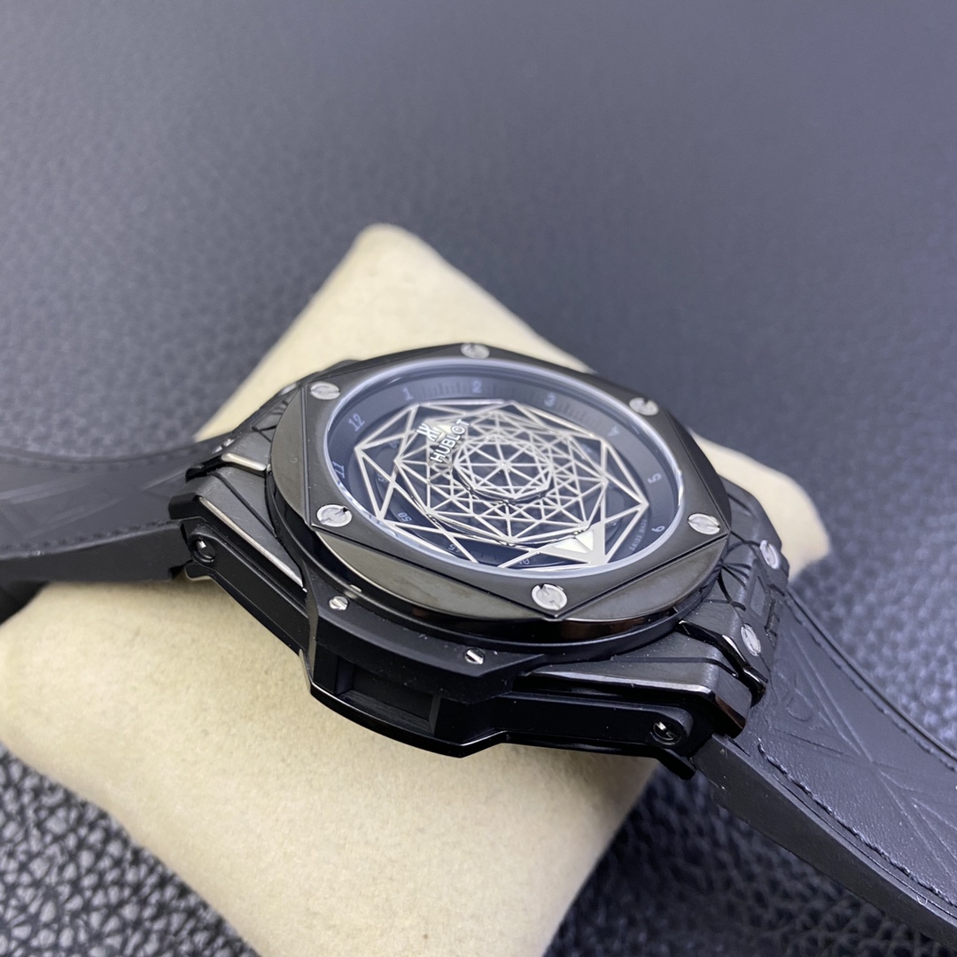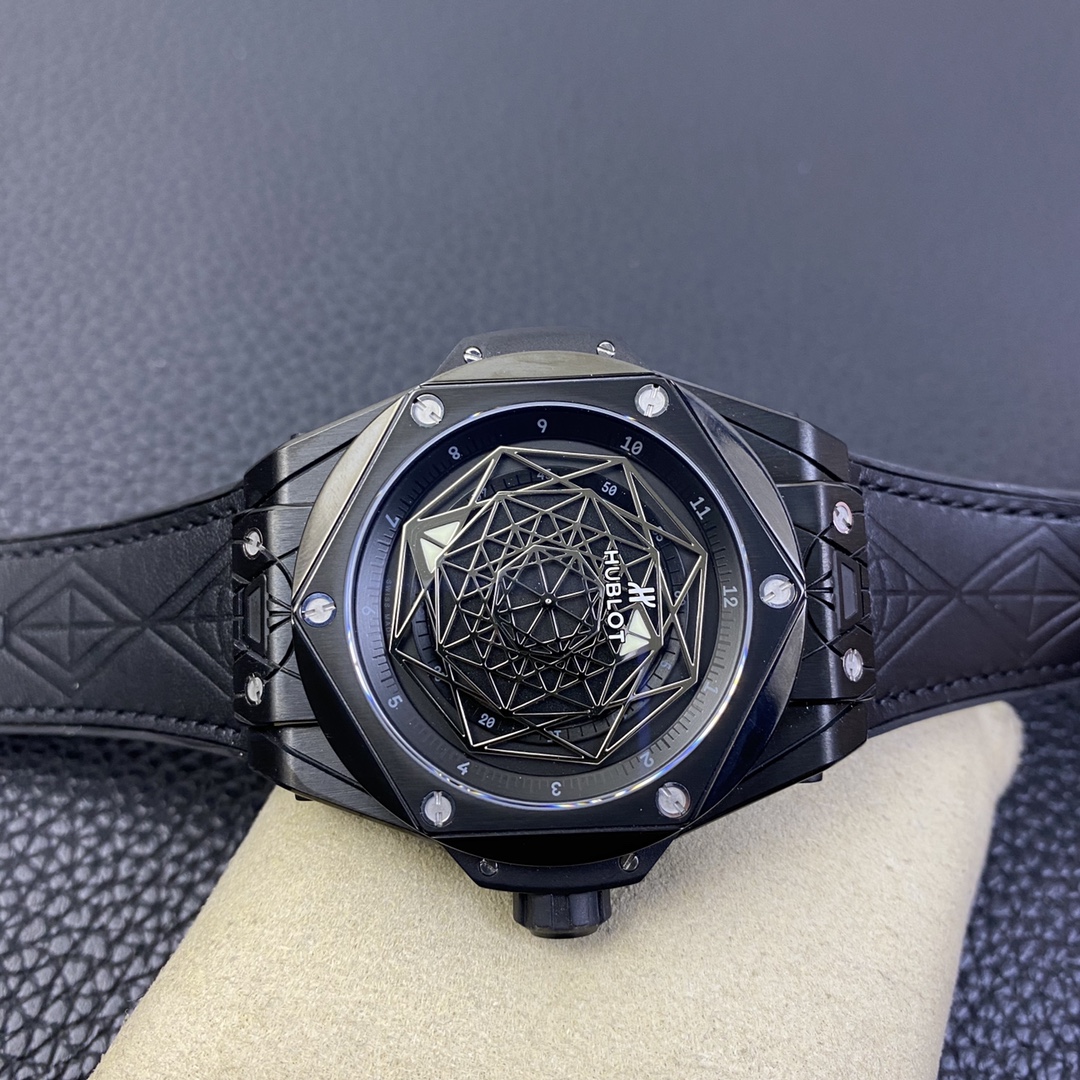 1. 45mm case diameter with graphic elements integrated into the hexagonal bezel through cutting and carving. The bezel is secured by 6 H-shaped titanium screws. The lugs of the watch have a strong design sense with steep angles and bold lines.