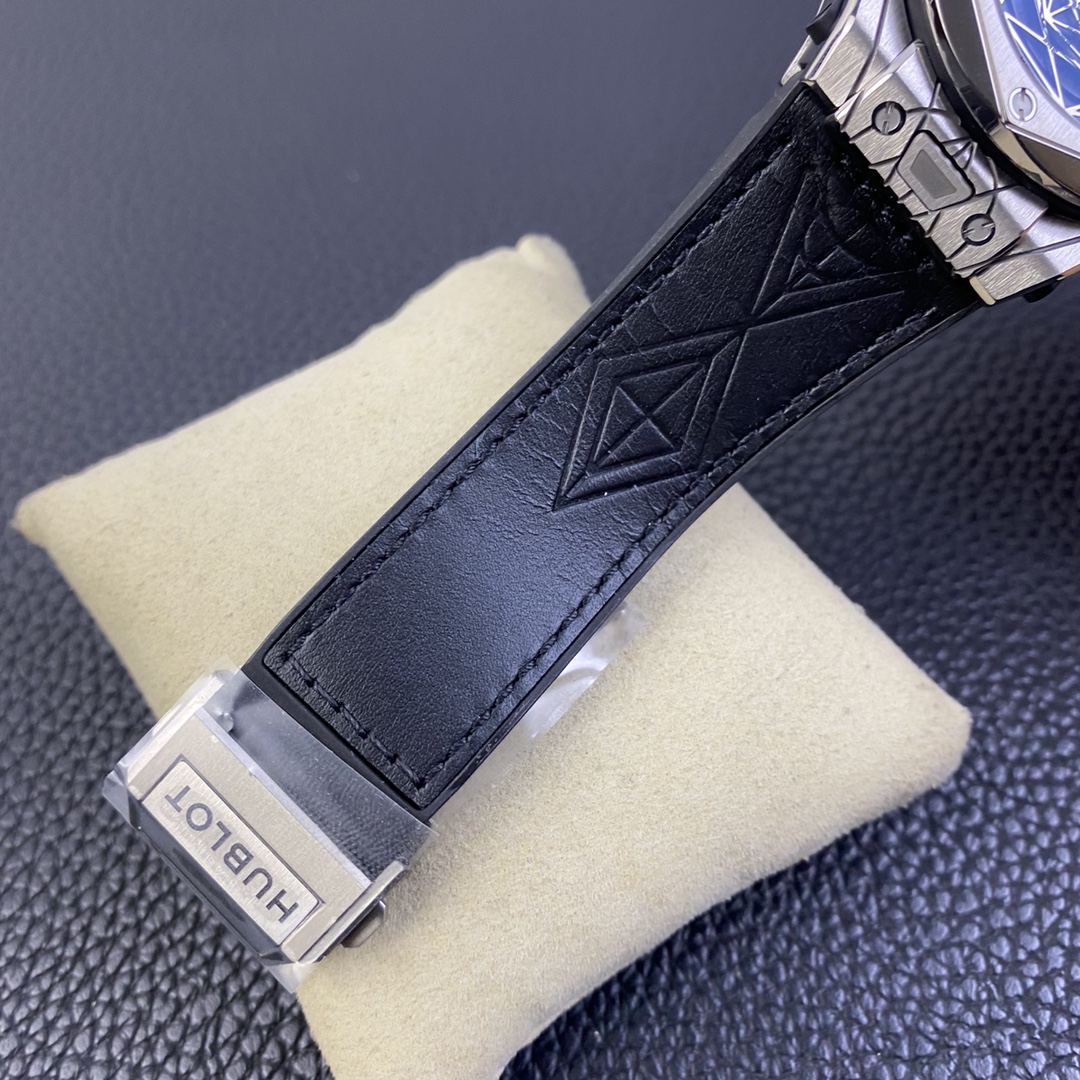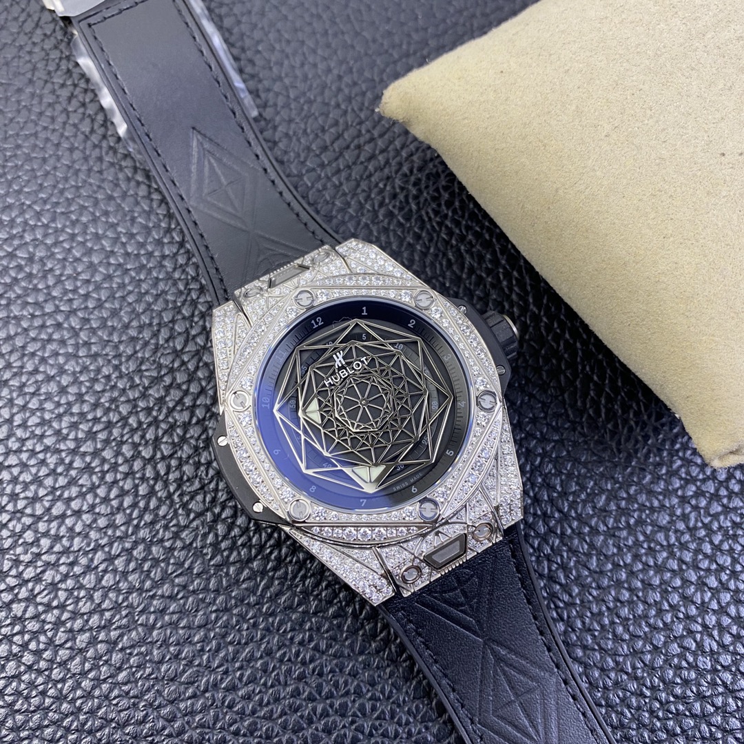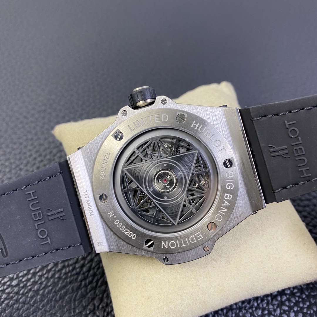1. 45mm case diameter with graphic elements integrated into the hexagonal bezel through cutting and carving. The bezel is secured by 6 H-shaped titanium screws. The lugs of the watch have a strong design sense with steep angles and bold lines.