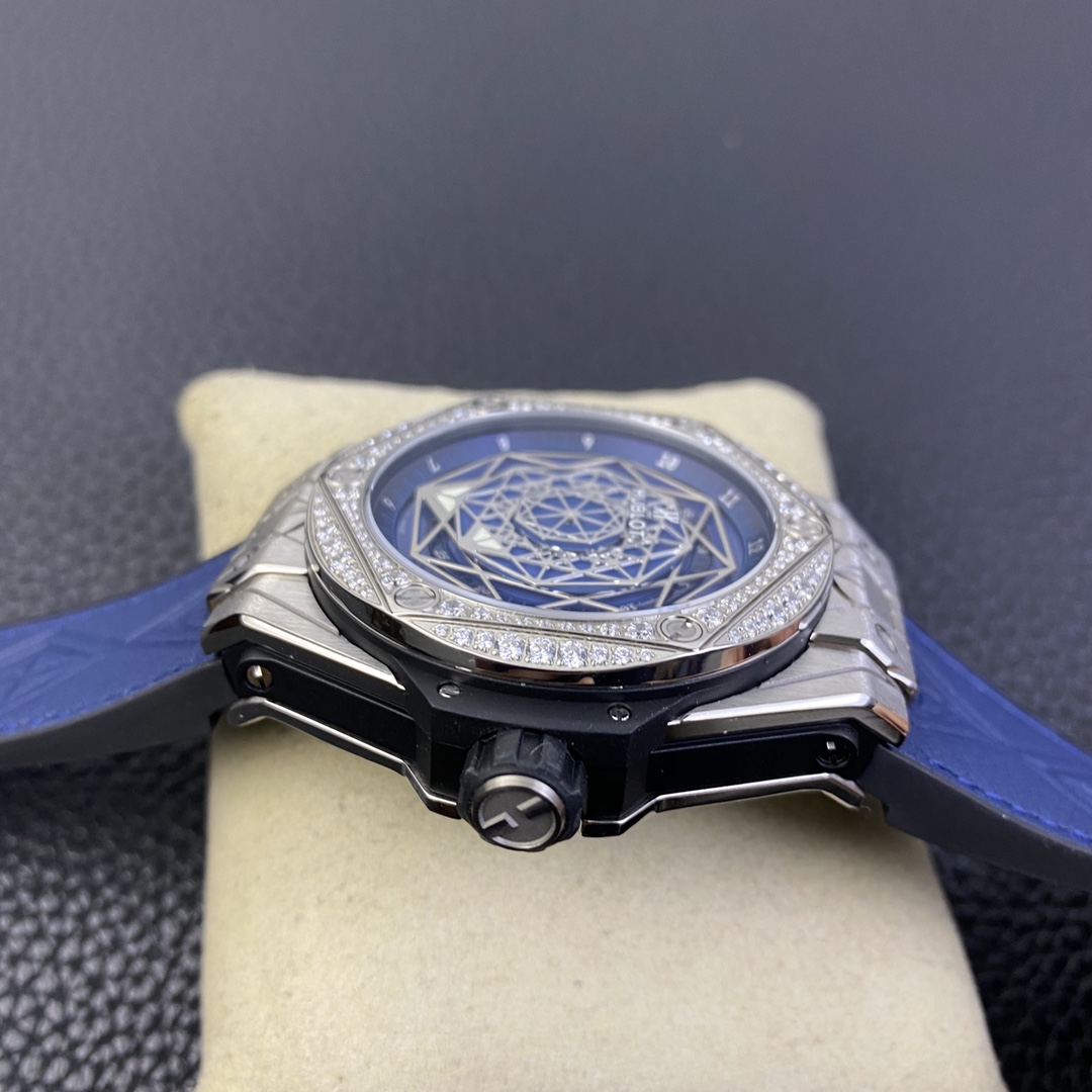 1. 45mm case diameter with graphic elements integrated into the hexagonal bezel through cutting and carving. The bezel is secured by 6 H-shaped titanium screws. The lugs of the watch have a strong design sense with steep angles and bold lines.