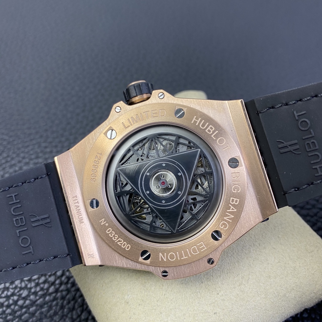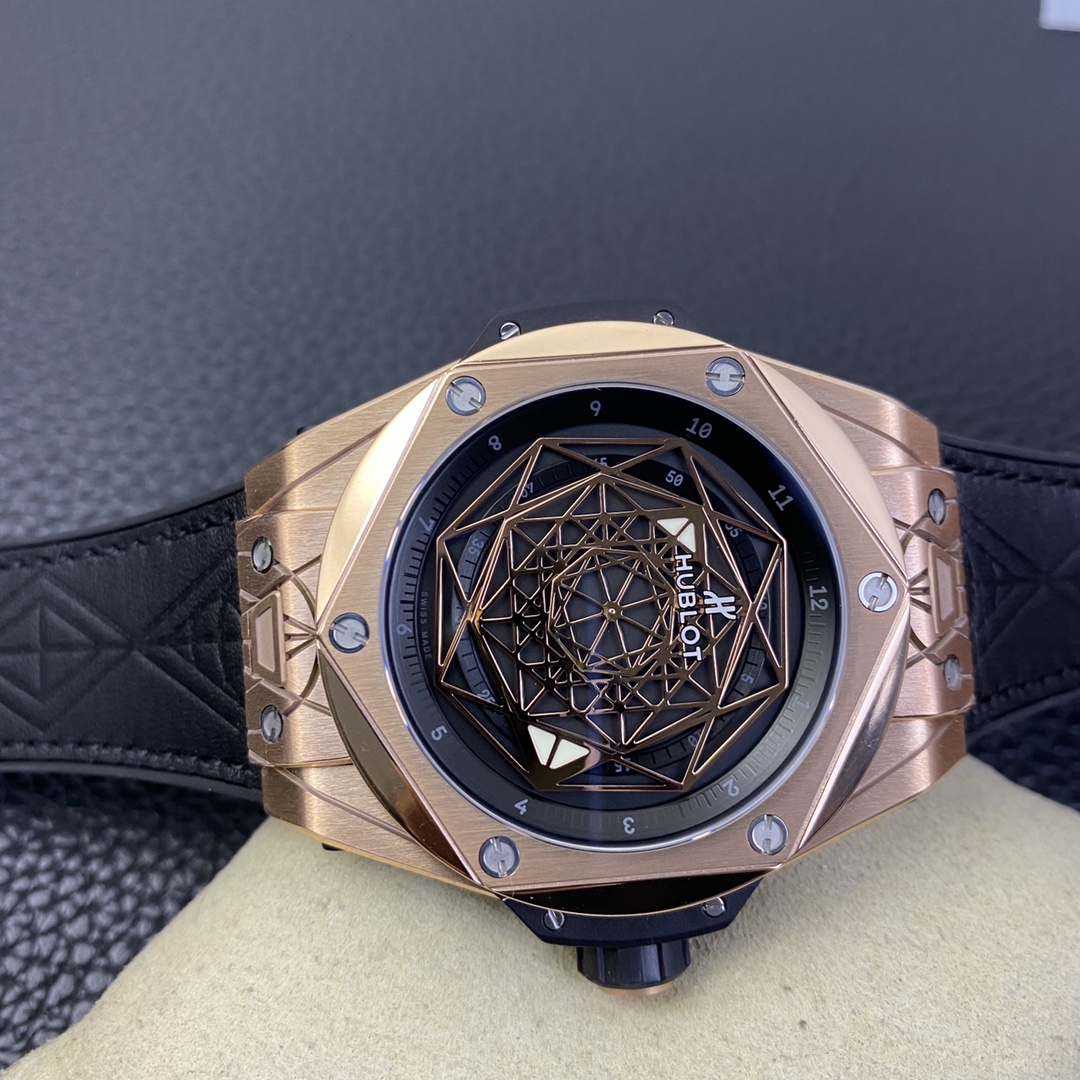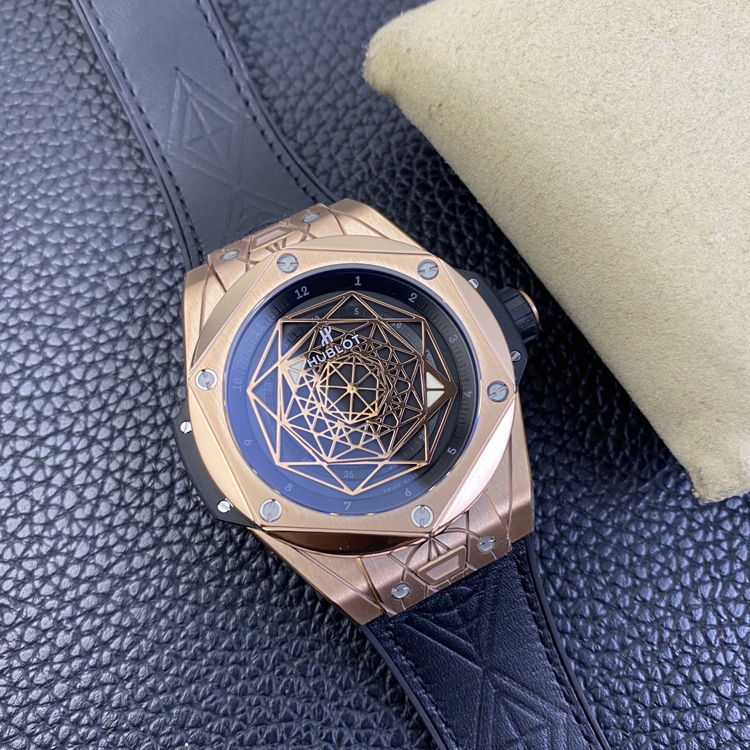 1. 45mm case diameter with graphic elements integrated into the hexagonal bezel through cutting and carving. The bezel is secured by 6 H-shaped titanium screws. The lugs of the watch have a strong design sense with steep angles and bold lines.