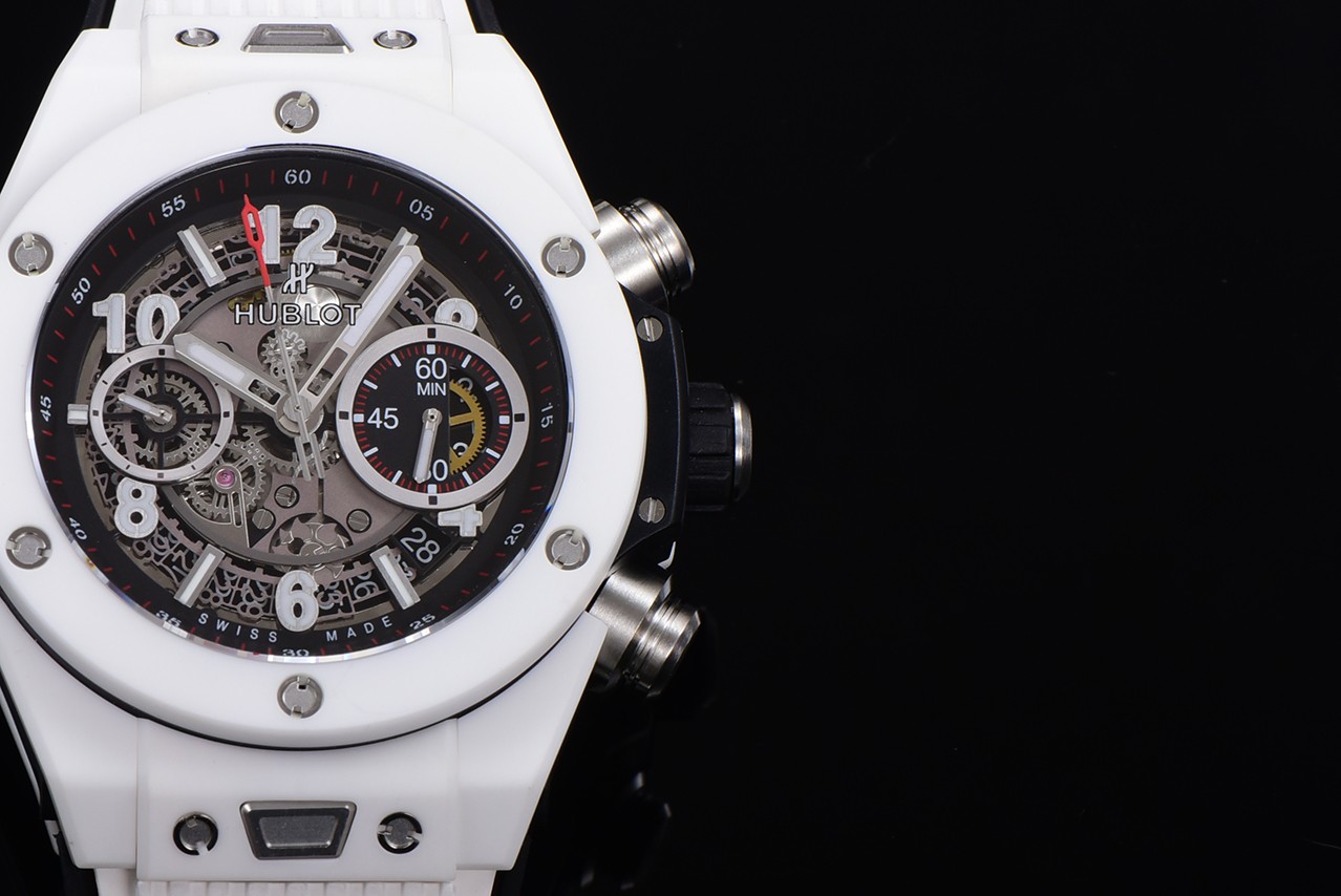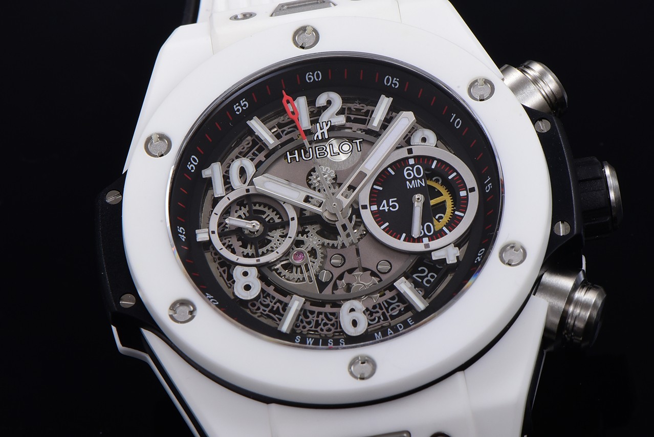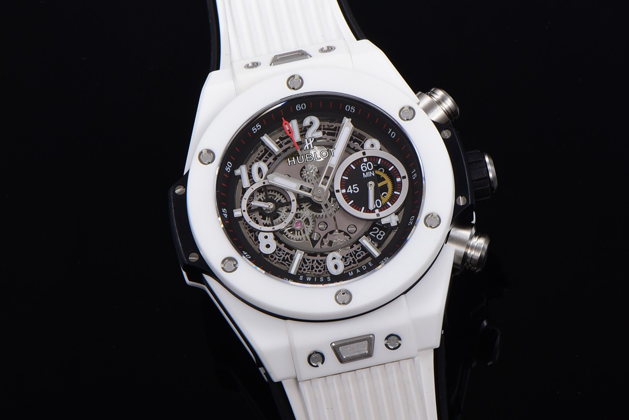 Exclusive UNICO HUB 1280 automatic flyback chronograph movement with a 3-subdial skeletonized date ring, a 3-subdial 60-minute chronograph, an 8-subdial horizontal clutch, a 9-subdial small seconds hand, sapphire crystal glass, a rubber strap with a ceramic folding clasp, colorful patterned hands, and a diameter of 45mm.