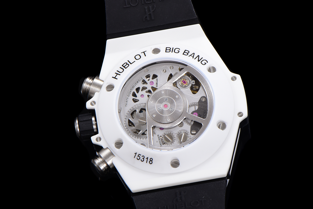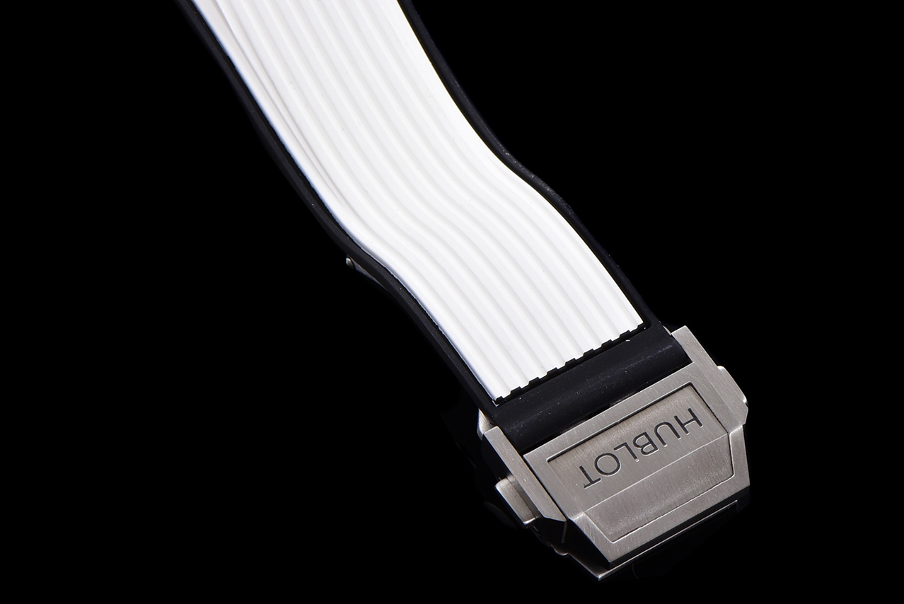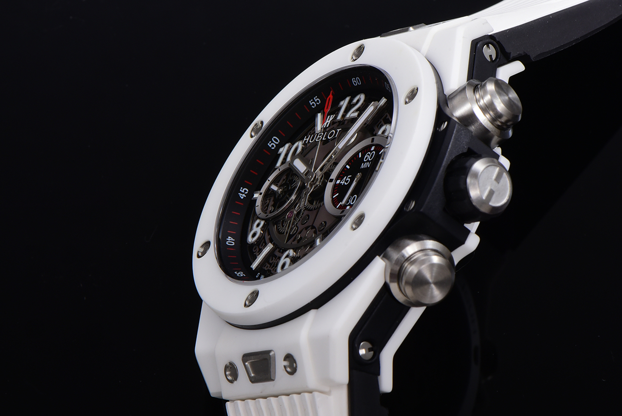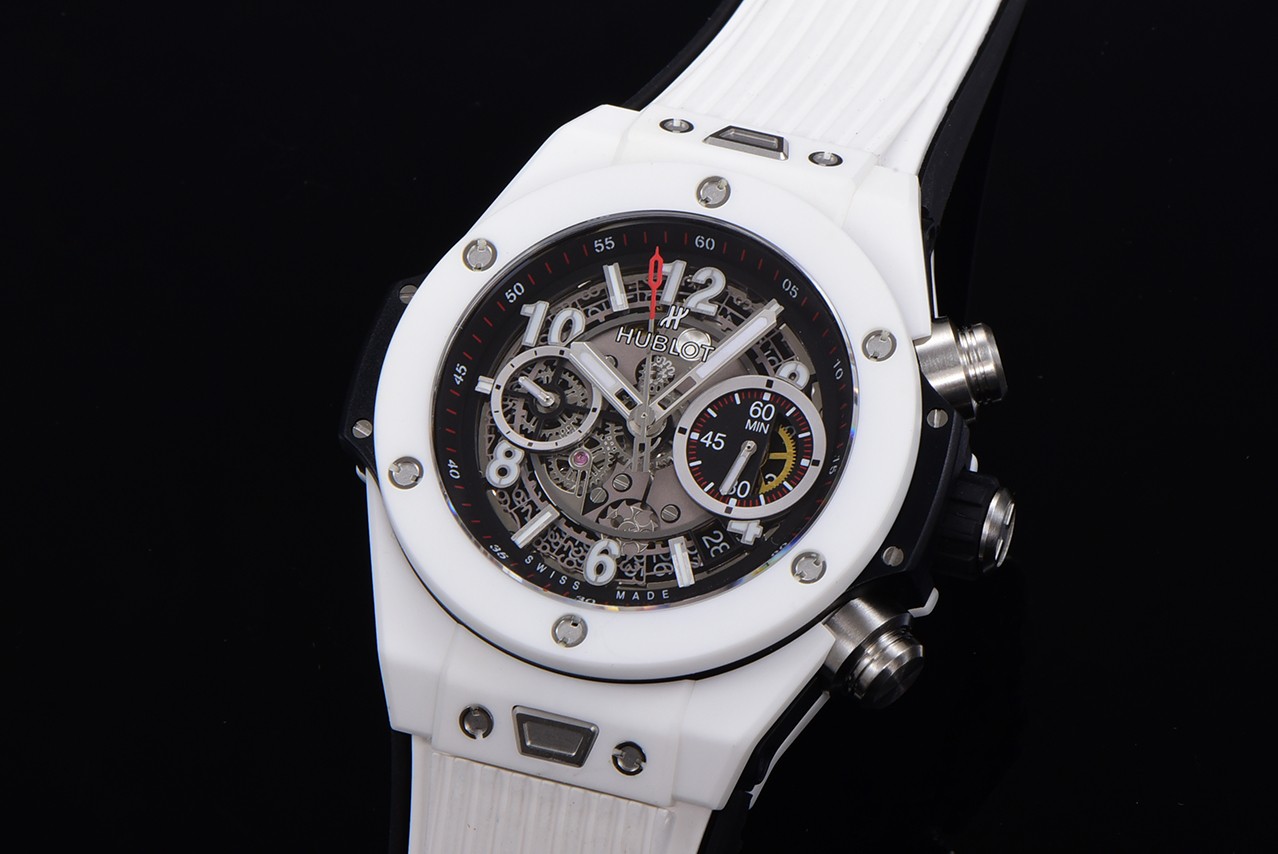 Exclusive UNICO HUB 1280 automatic flyback chronograph movement with a 3-subdial skeletonized date ring, a 3-subdial 60-minute chronograph, an 8-subdial horizontal clutch, a 9-subdial small seconds hand, sapphire crystal glass, a rubber strap with a ceramic folding clasp, colorful patterned hands, and a diameter of 45mm.