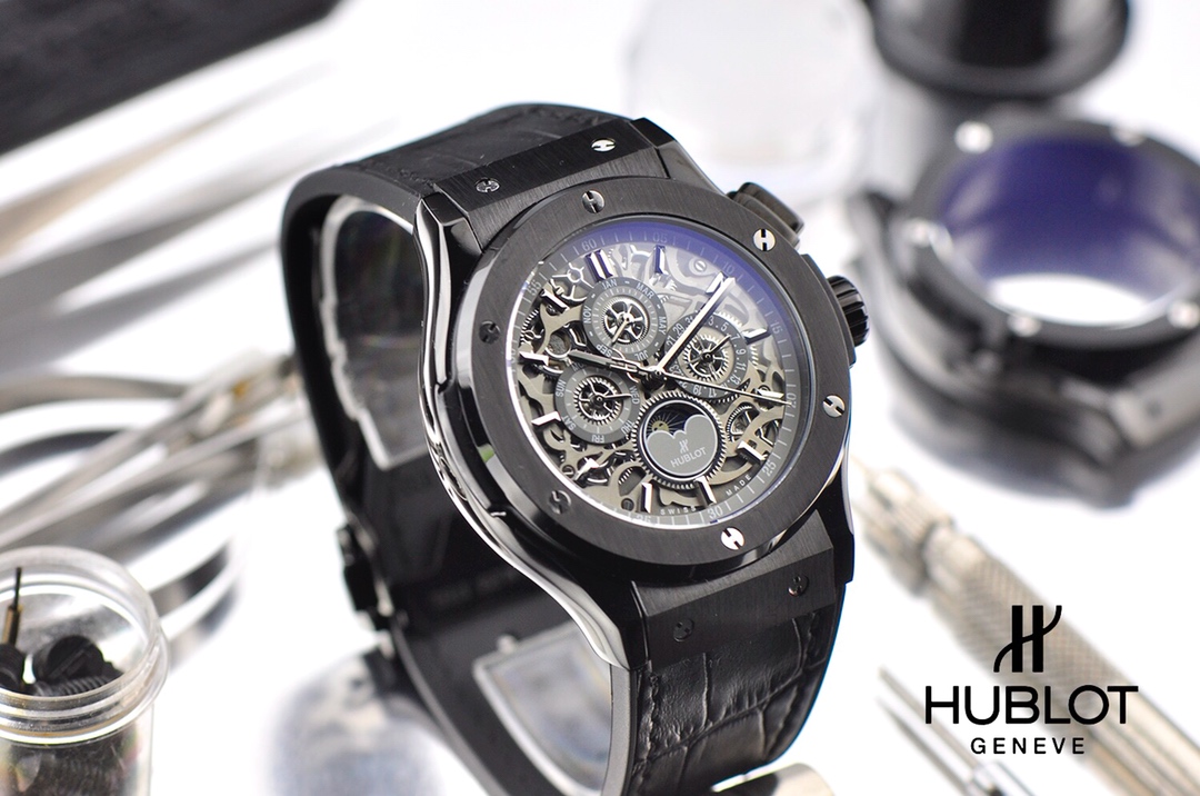 With a diameter of 45mm, this watch showcases the micro-mechanical marvels inside. The skeletonized design creates another magnificent landscape in the art of watchmaking, allowing the wearer to appreciate the inner workings of the timepiece. Hublot adheres to the concept of “the art of fusion” and has conceived an unprecedented concept of skeletonized watches, endowing it with a unique modern structural beauty. This timepiece features functions such as day, date, month, and day/night display.