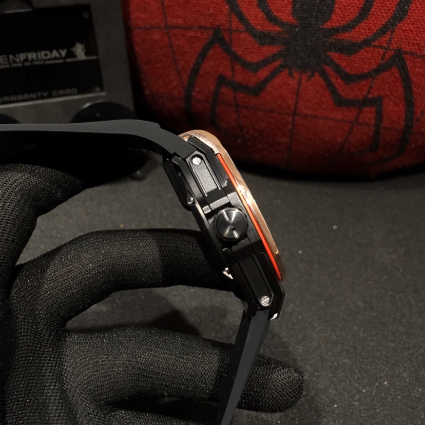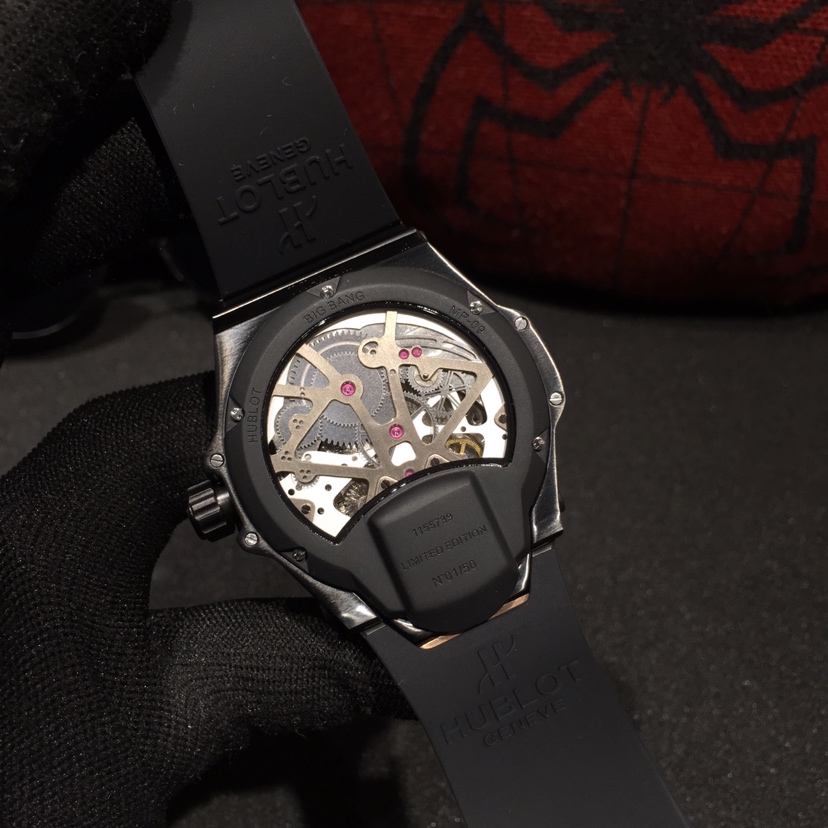 This is the Hublot MP Collection watch, specifically the MP-09 Automatic Mechanical model. It features a polished metal case with artificial inlaid 207 zircon stones. The lower structure of the watch is made of anodized red aluminum and is adorned with six H-shaped metal screws. It is powered by an imported automatic mechanical movement, codenamed “Warcraft,” making it a legendary timepiece. The MP-09 Automatic Mechanical watch offers a whole new perspective with its multi-axis tourbillon. It has a size of 45mm and comes with a rubber strap paired with an original buckle, exuding a strong futuristic and technological vibe. The unprecedented design will leave you visually stunned!
