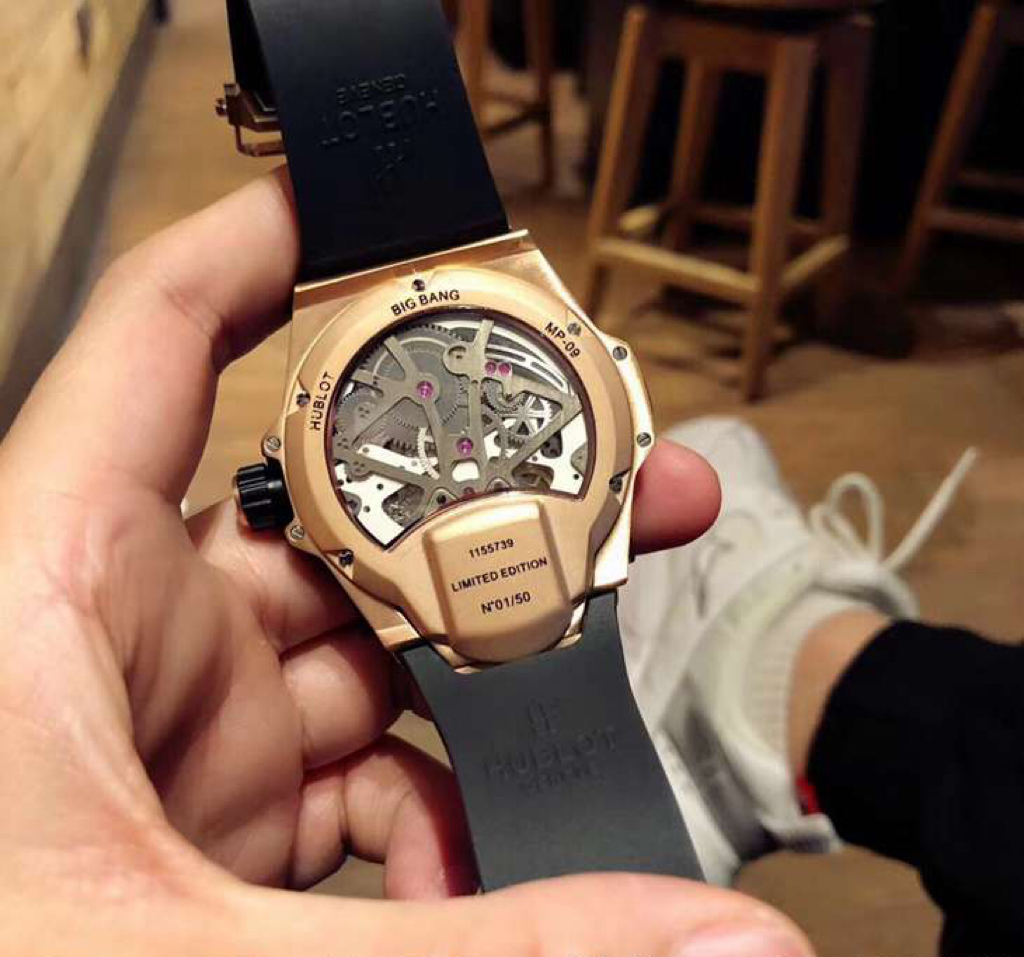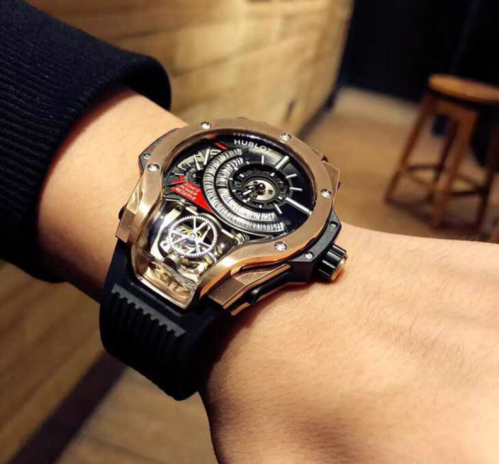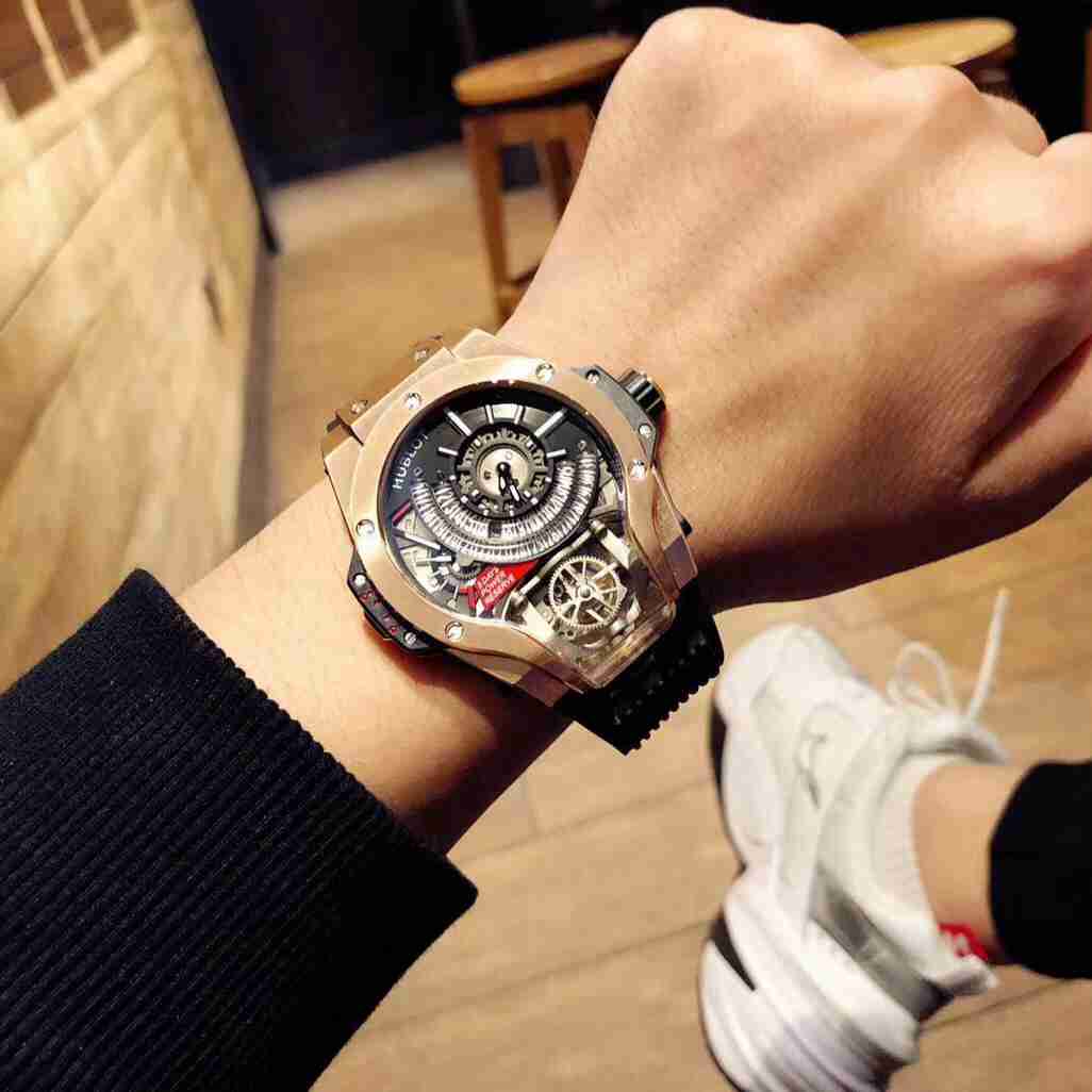 This is the Hublot MP Collection watch, specifically the MP-09 Automatic Mechanical model. It features a polished metal case with artificial inlaid 207 zircon stones. The lower structure of the watch is made of anodized red aluminum and is adorned with six H-shaped metal screws. It is powered by an imported automatic mechanical movement, codenamed “Warcraft,” making it a legendary timepiece. The MP-09 Automatic Mechanical watch offers a whole new perspective with its multi-axis tourbillon. It has a size of 45mm and comes with a rubber strap paired with an original buckle, exuding a strong futuristic and technological vibe. The unprecedented design will leave you visually stunned!