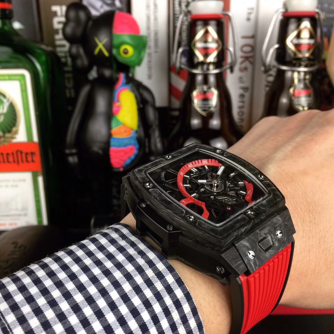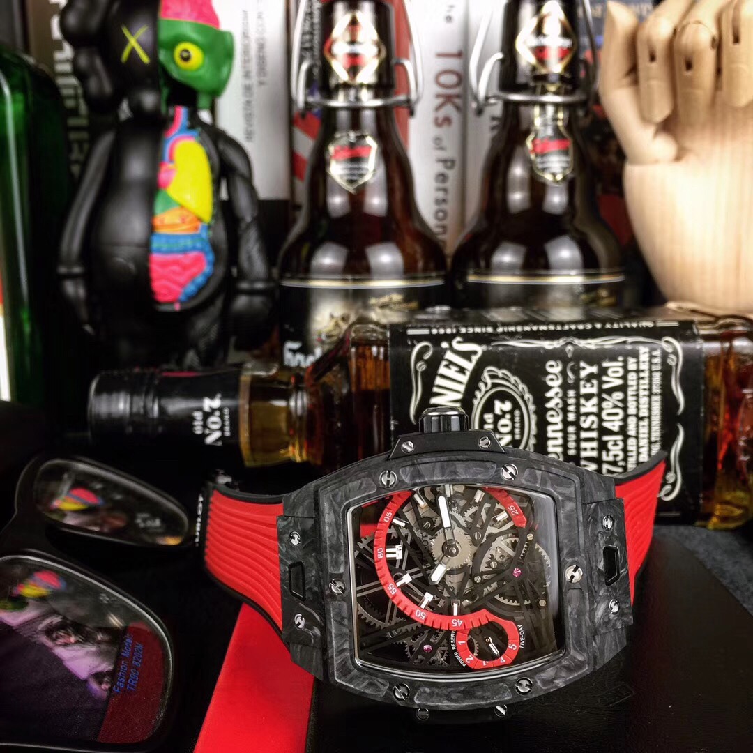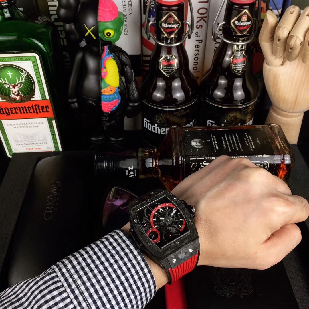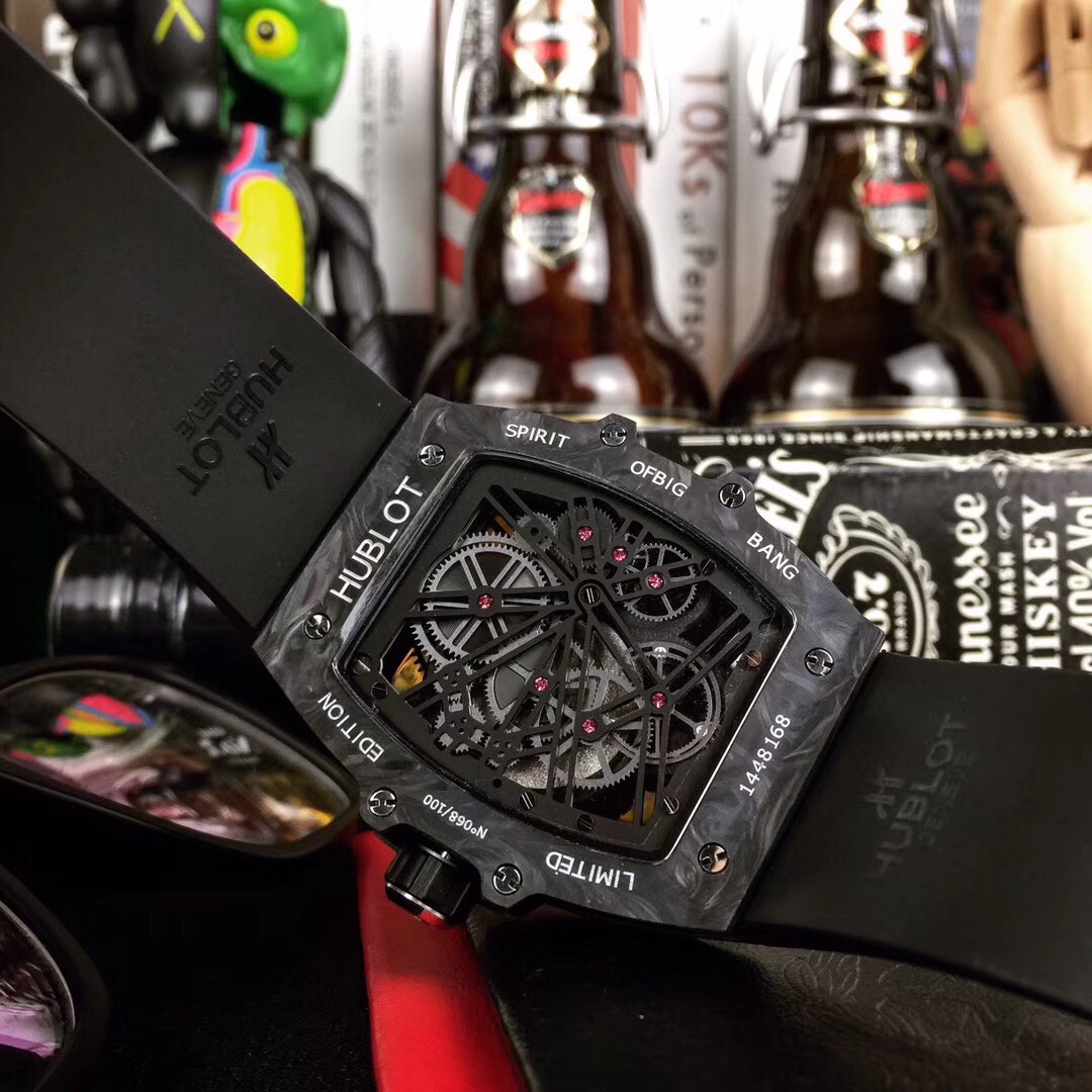 The iconic barrel-shaped case of the BIG BANG Soul Series is made of carbon fiber material, perfectly blending with the characteristics of luminescent particles. It presents a cosmic scene in the dark night, showcasing a fusion of beauty. With a diameter of 42 millimeters, it is equipped with an imported mechanical movement. The frequency is 28,800 vibrations per hour, and it comes with a rubber strap and an original buckle.