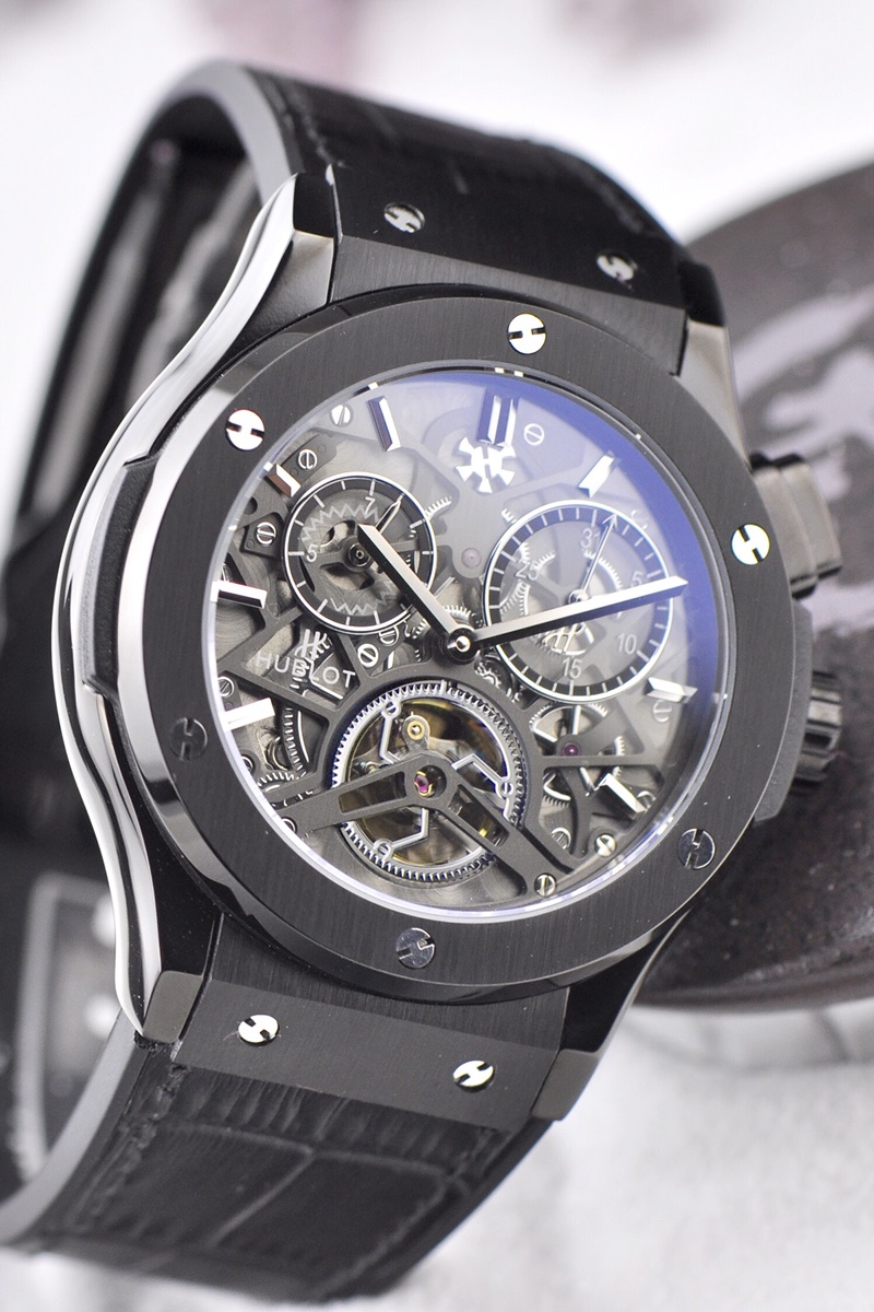 With a diameter of 45mm, this watch showcases the micro-mechanical marvels inside. The skeletonized design creates another magnificent landscape in the art of watchmaking, allowing the wearer to appreciate the inner workings of the timepiece. Hublot adheres to the concept of “the art of fusion” and has conceived an unprecedented concept of skeletonized watches, endowing it with a unique modern structural beauty. This timepiece also features a day and date function, adding practicality to its design.