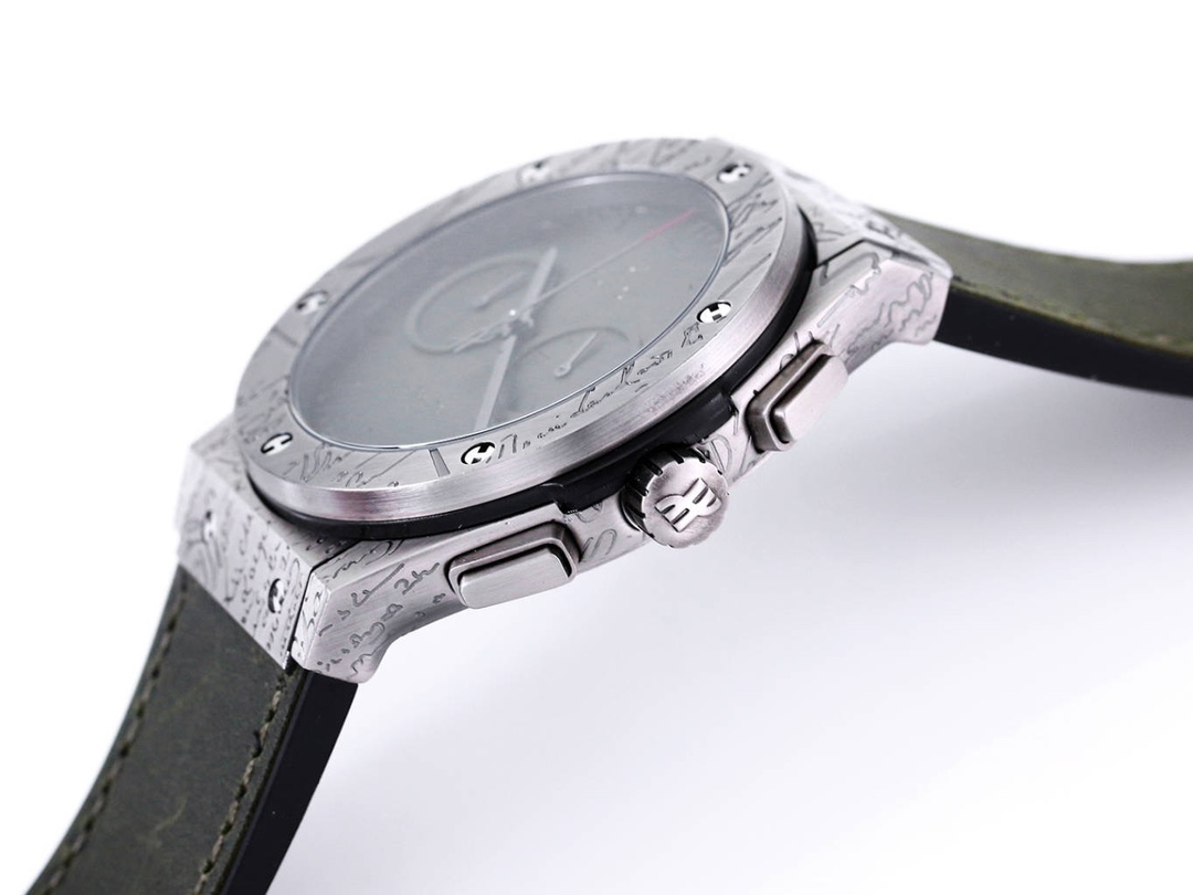 The high-hardness mineral glass is coated with a film and the bezel is engraved with a tobacco leaf and the letter “X,” which is the emblem of the Fonte family. The back of the watch is decorated with a special pattern that evokes memories of the Cuban town of Guines, where the Fonte family originated.