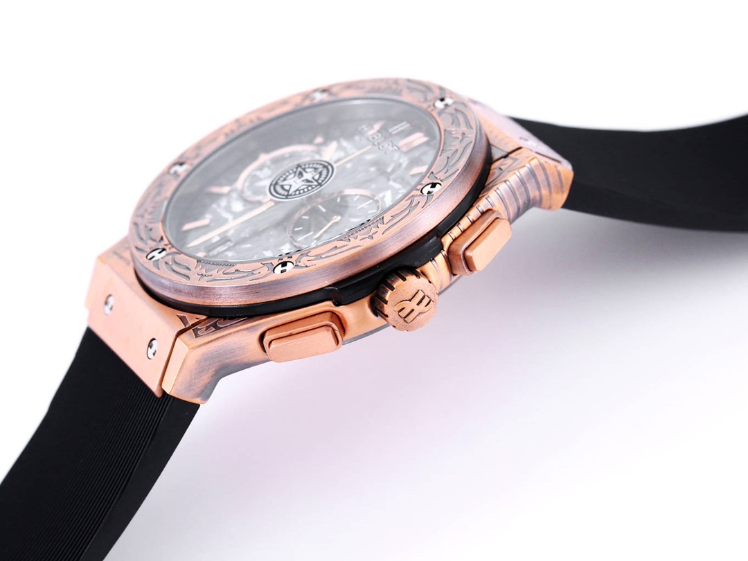 The watch features a carved design on the case using 316L stainless steel combined with layers of titanium, carbon, and copper through a direct electroplating process. It is equipped with an imported quartz movement for accurate timekeeping.