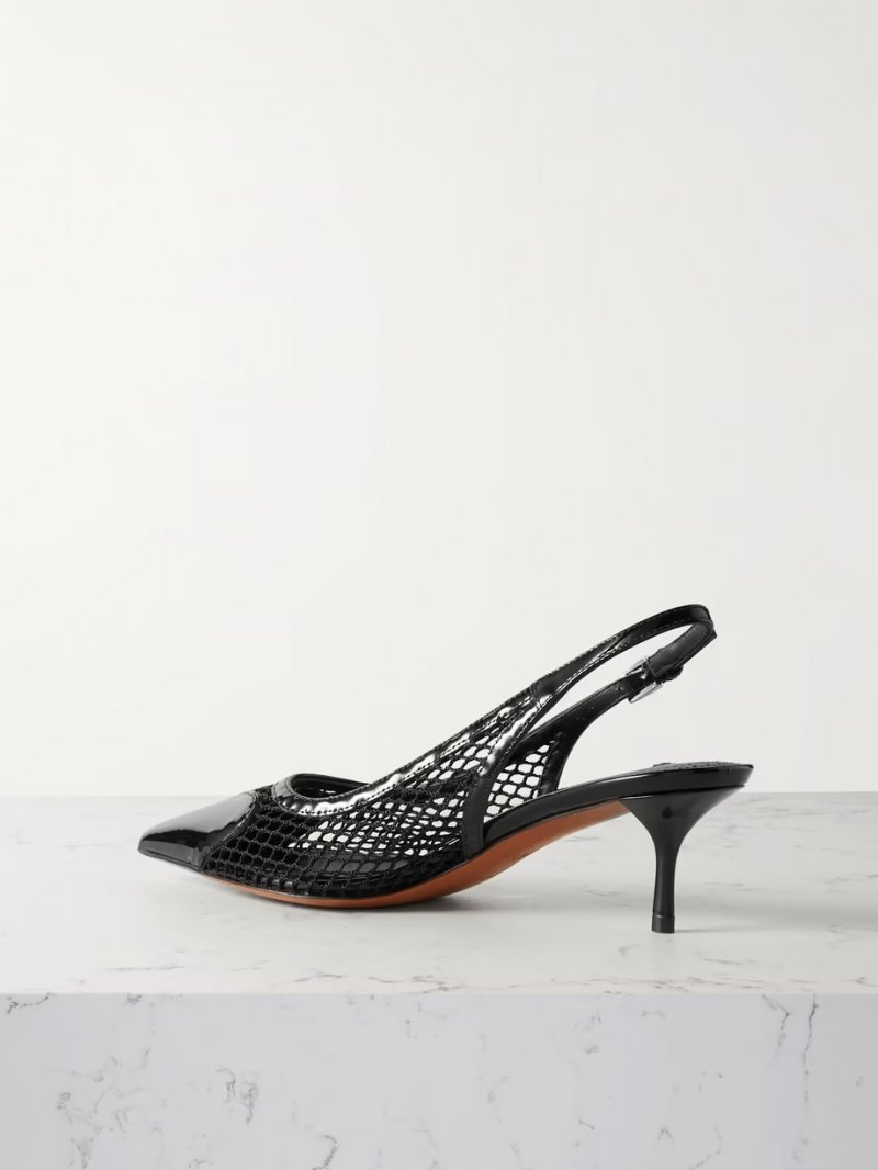 - Black mesh and patent-leather