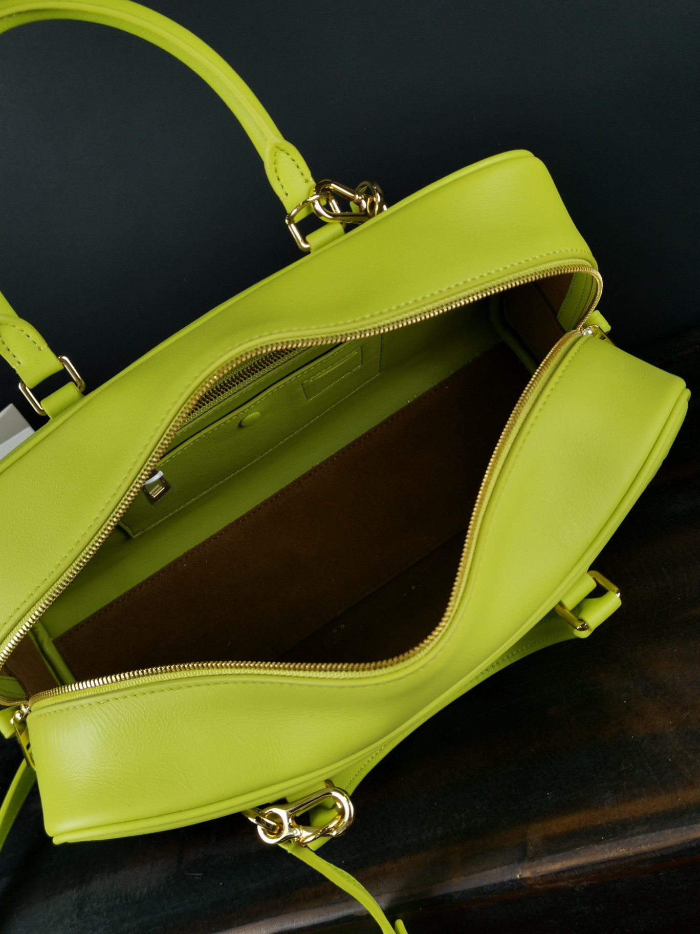 It can be worn as a crossbody, shoulder bag, or carried by the top handle. The bag features a detachable and adjustable shoulder strap, an interior zip compartment, and fixed pockets secured with snaps. The leather zipper pulls include a mini pocket for storing the lock key.
